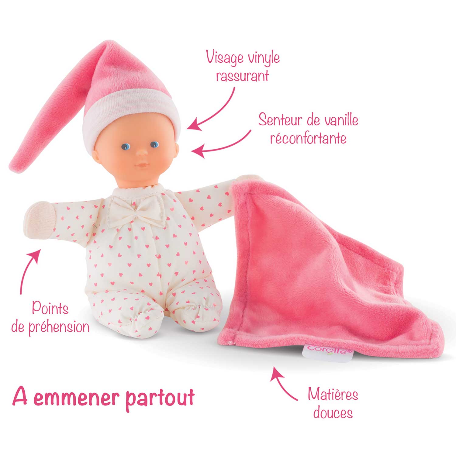 Le doudou qui se glisse partout. Visage vinyle rassurant. Senteur de vanille réconfortante. 16 cm. Minirêve : c’est mon doudou qui se glisse partout. Ce que je préfère, chez lui, c’est sa douceur. J’aime en effet caresser le petit carré de tissu qu’il tient dans sa main. Ce que mes parents préfèrent quant à eux, c’est sa petite taille. Un mini-doudou de 16 cm, facile à transporter et qu’ils peuvent glisser partout : dans un sac, sous la poussette, dans une poche de manteau... Sa petite frimousse en vinyle est tellement réaliste qu’elle me permet d’être rassuré(e) dès que je le regarde. Parfois, quand j’en ai besoin, je l’attrape facilement par son chapeau pointu, ses bras ou ses jambes et je le serre fort tout contre moi. Je sEnsemble alors la délicate senteur de vanille m’envelopper et me réconforter pour longtemps. Mon Minirêve et moi, on est inséparables. Car même si je l’oublie quelque part, on me le rendra : il possède une étiquette pour écrire mon prénom ou le numéro de téléphone de mes parents. Lavable en machine, cycle délicat. mon doudou Corolle : Toi et moi, pour toujours. Dès la naissance.