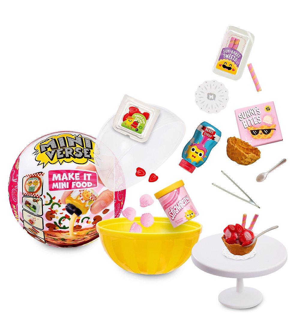 Mini jouets...grandes surprises ! Déballez vos aliments préférés au format mini. La différence entre Miniverse et les autres?? Fabriquez vous-même son propre plat ou sa propre boisson. Mélangez tous les ingrédients, ajoutes-y la résine. Poser à la lumière du jour ou sous une lampe UV pendant au moins 5 minutes et c’est prêt!! Collectionnez-les toutes!!
