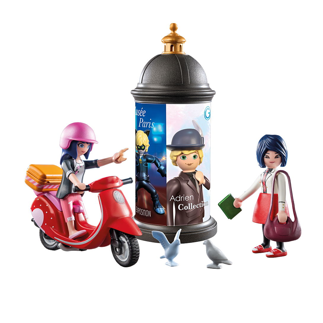 Personnages : 2 femmes (Marinette Dupain-Cheng & Kagami Tsurugi) Animaux : 2 colombes Accessoires : 1 colonne morris, 1 scooter avec panier, 1 casque, 3 croissants, 1 sac à bandoulière, 1 pochette.