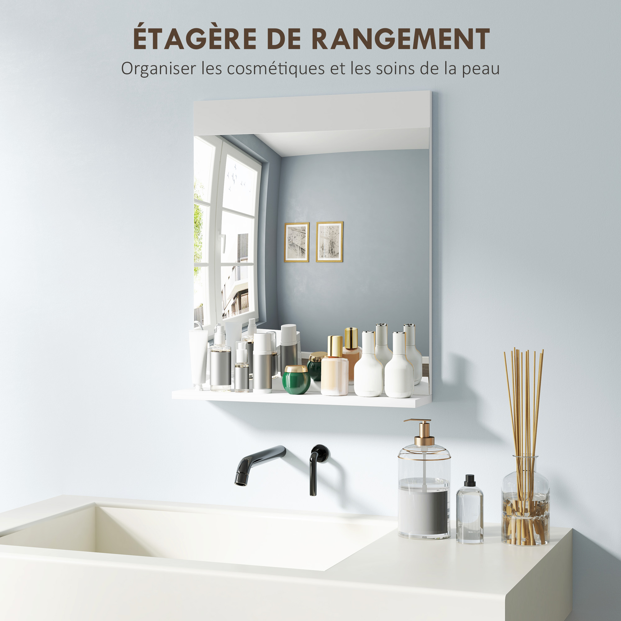 Ce miroir mural HOMCOM avec étagère optimise l'espace et organise vos produits de beauté. Son cadre brillant protège le verre et ajoute une touche élégante à tout intérieur, de la salle de bain au salon, alliant style et fonctionnalité pour un look soigné.