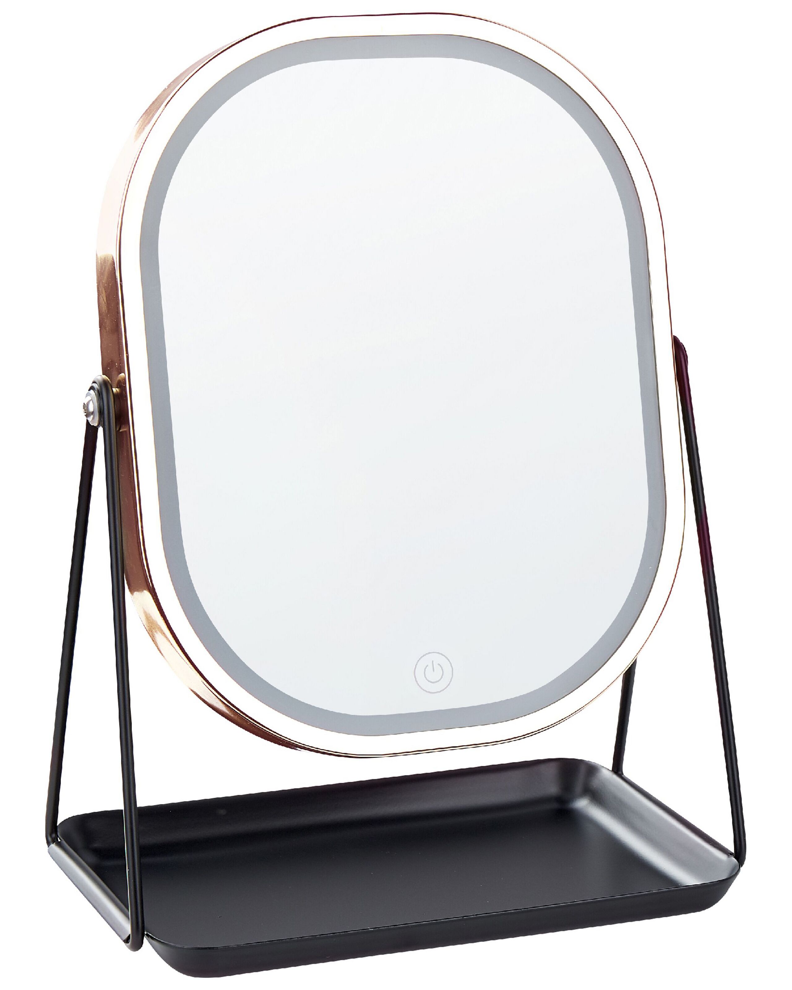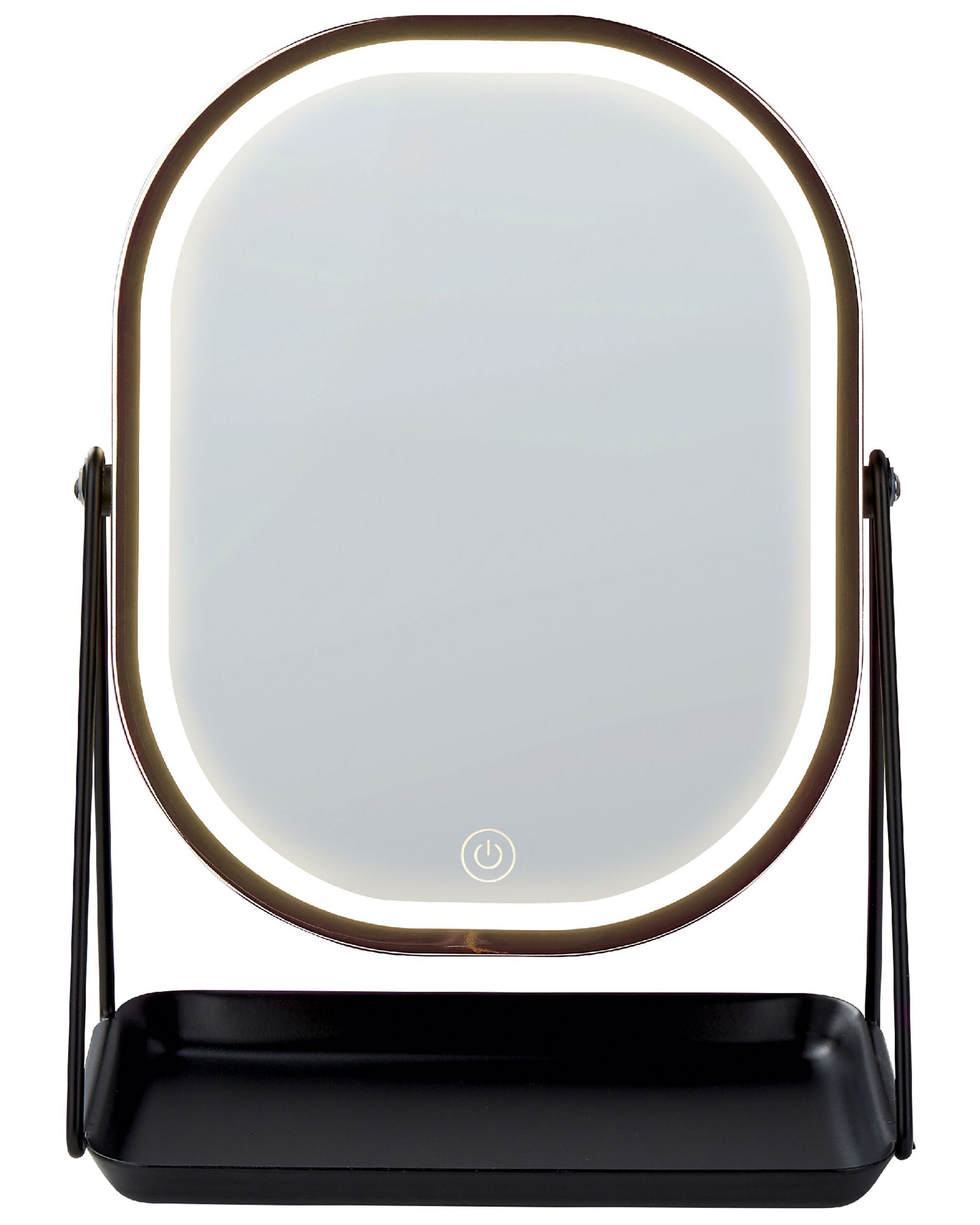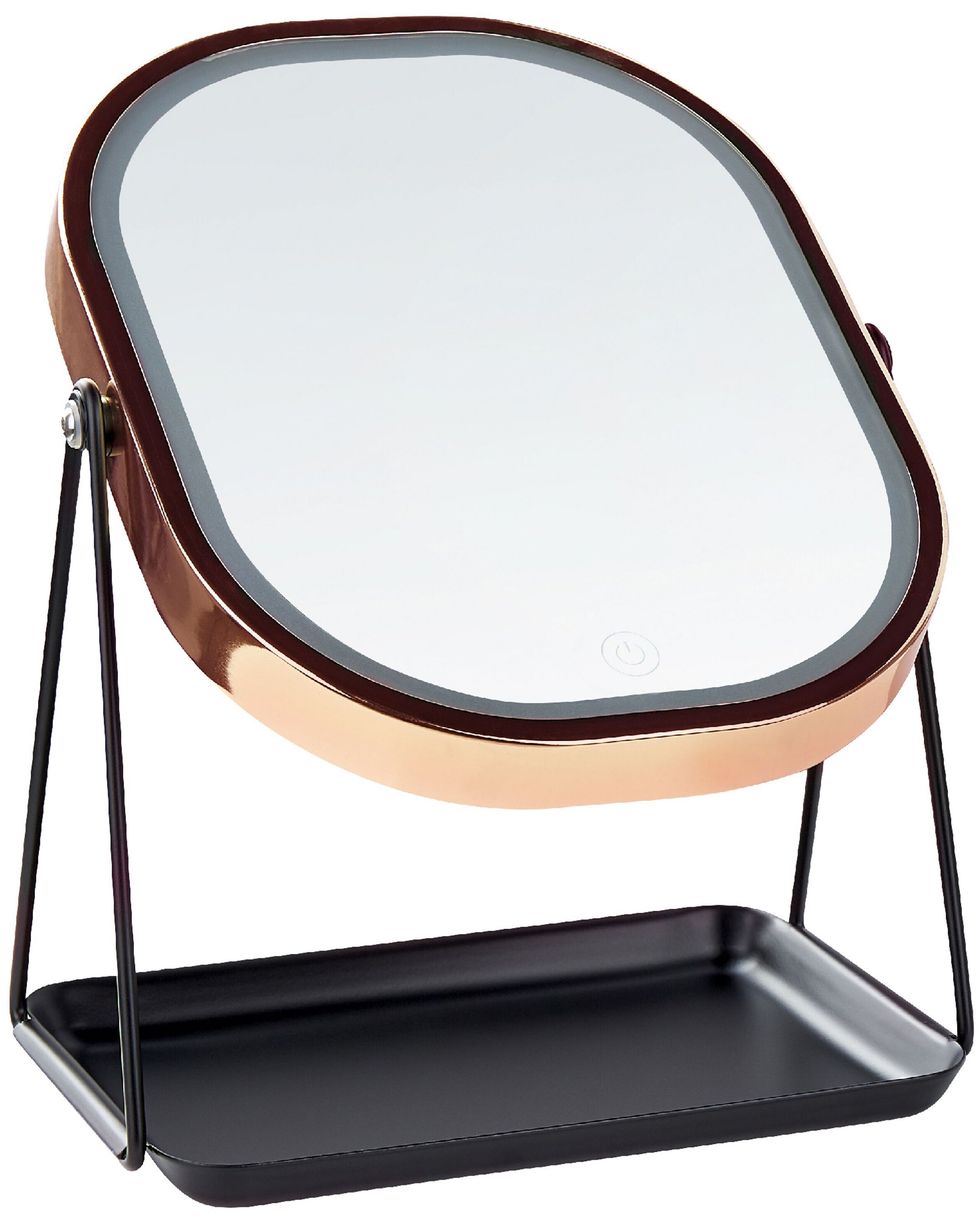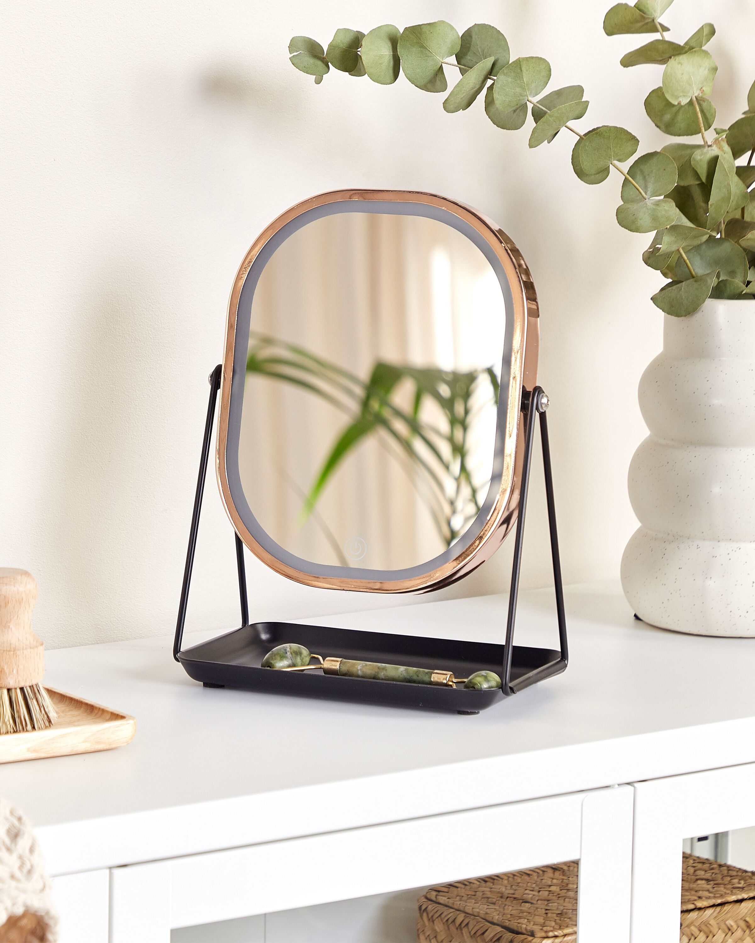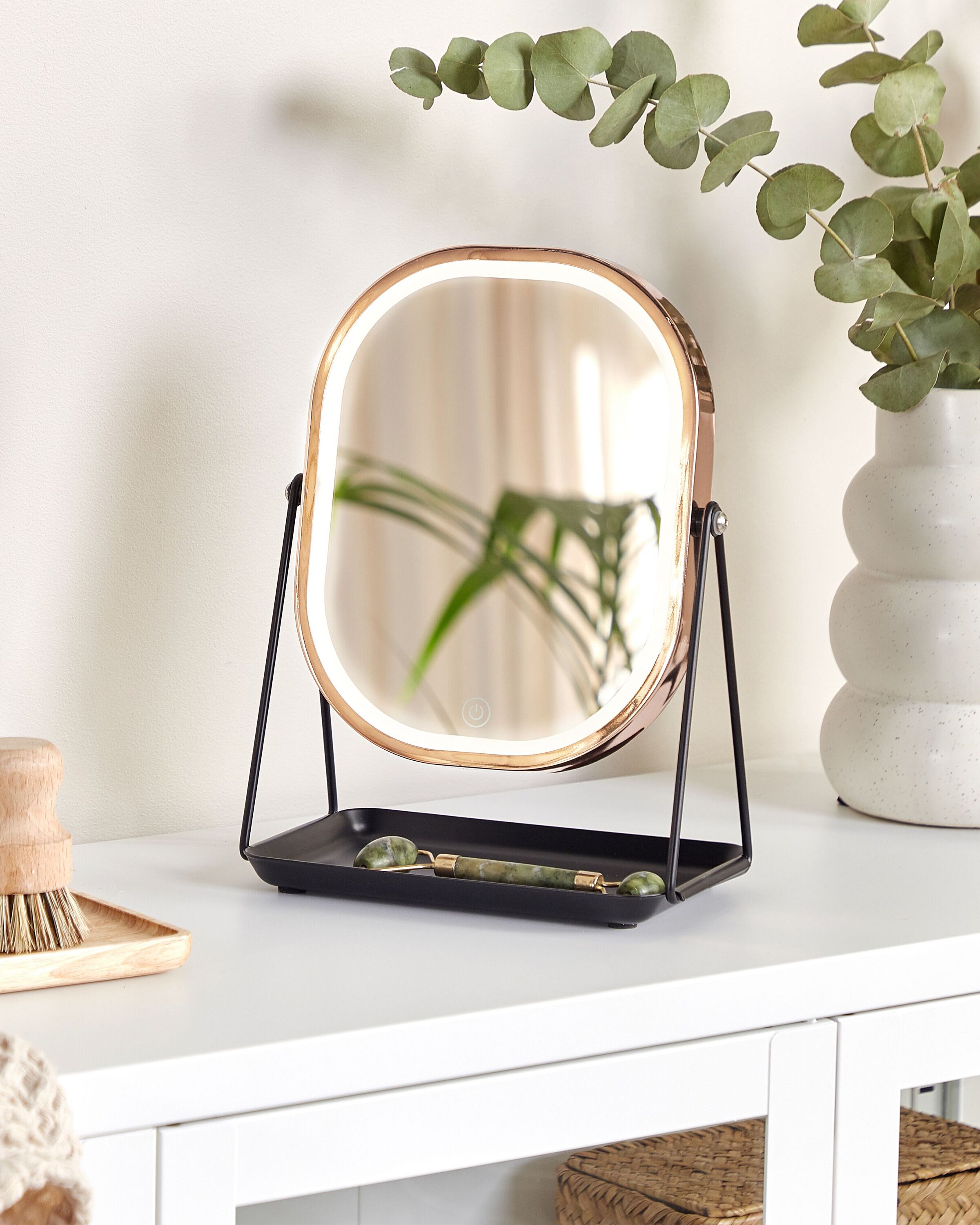 Miroir de table décoratif avec éclairage LED. Ajoutez de la fonctionnalité et de l'élégance à votre salle de bains, votre chambre ou votre dressing avec ce miroir de maquillage. Il est fabriqué en métal de haute qualité et dispose d'un éclairage LED intégré avec trois intensités de couleur qui facilitera votre routine beauté. La base en forme de plateau peut être utilisée pour ranger des cosmétiques ou des bijoux.
