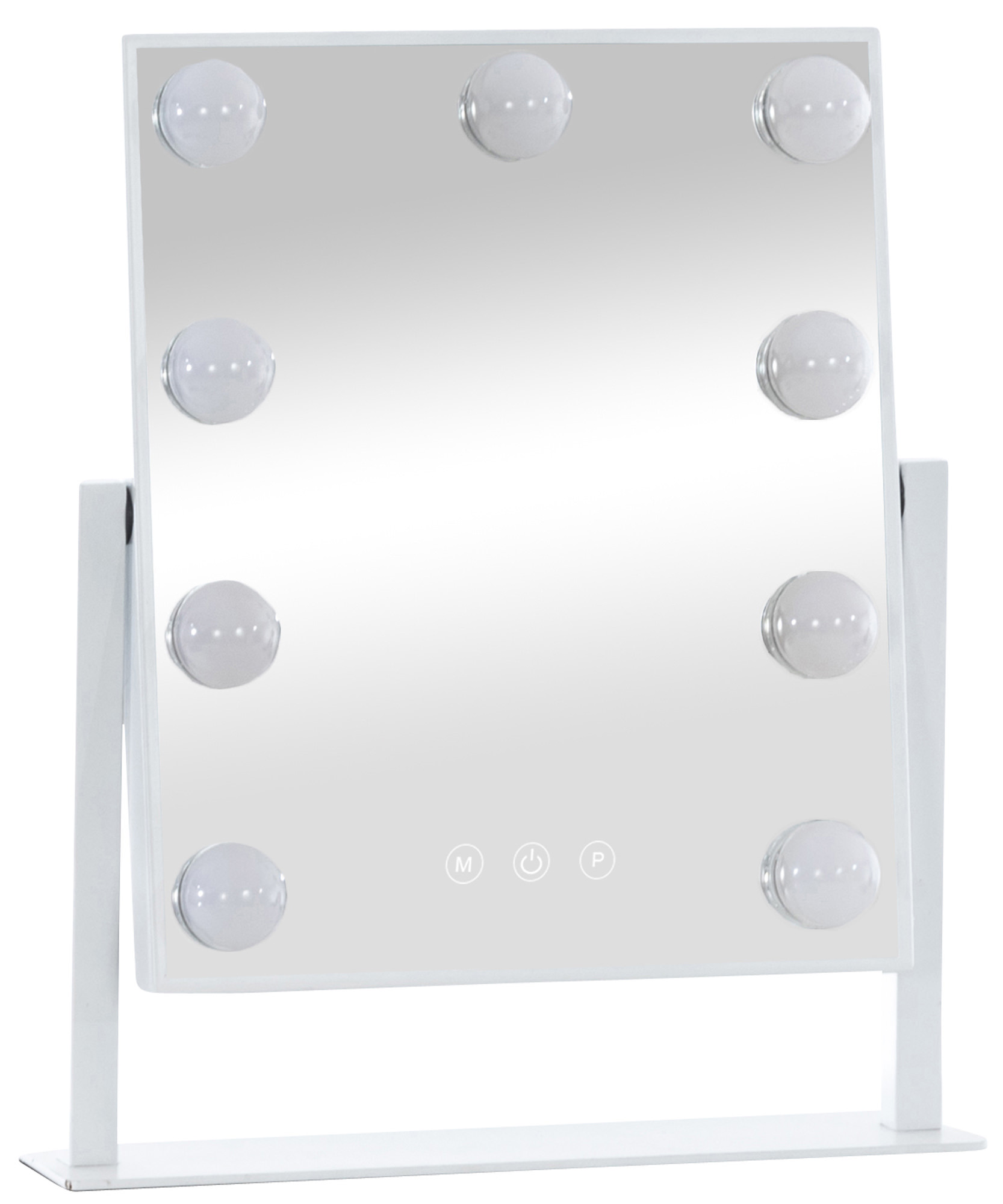 Le miroir de maquillage Majuro est équipé de 9 lumières LED à économie d'énergie. Les lumières sont intégrées et font le tour du cadre. Cela permet un éclairage optimal et une répartition idéale de la lumière. Une manipulation facile est possible grâce à la commande à écran tactile. Il suffit de toucher le capteur pour conttrôler l'éclairage. Trois modes sont disponibles: blanc chaud (intense), blanc neutre (lumière du jour) ou blanc froid et les ampoules LED sont dimmables. Grâce à la fonction de mémoire intelligente, il est également possible d'enregistrer le dernier mode utilisé. Cela vous évitera de régler la luminosité à chaque utilisation. Le miroir peut, en outre, être incliné. Que ce soit en milieu professionnel, dans un salon de cosmétique ou en privé sur une coiffeuse, ce miroir vous permettra de vous maquiller et d'effectuer vos soins et épilation de visage dans les meilleures conditions.