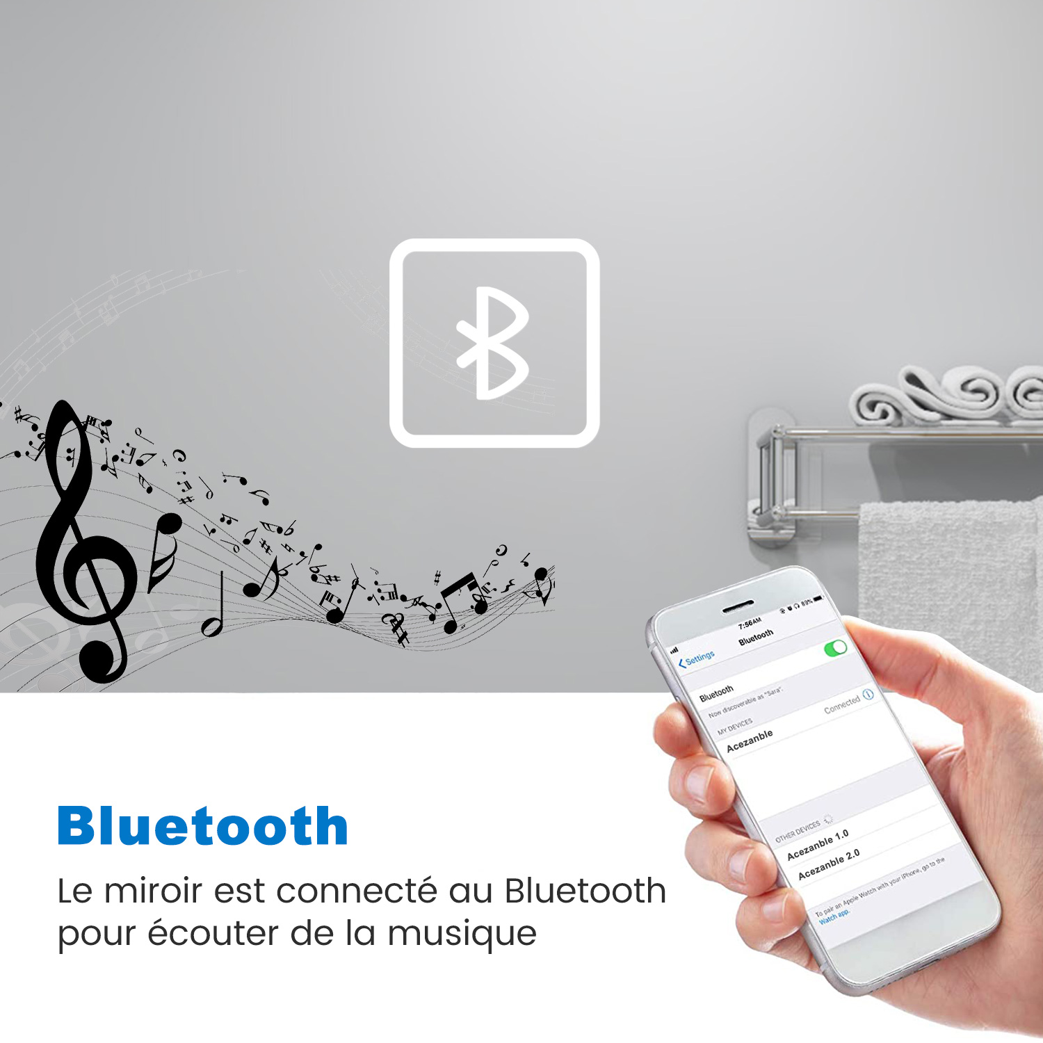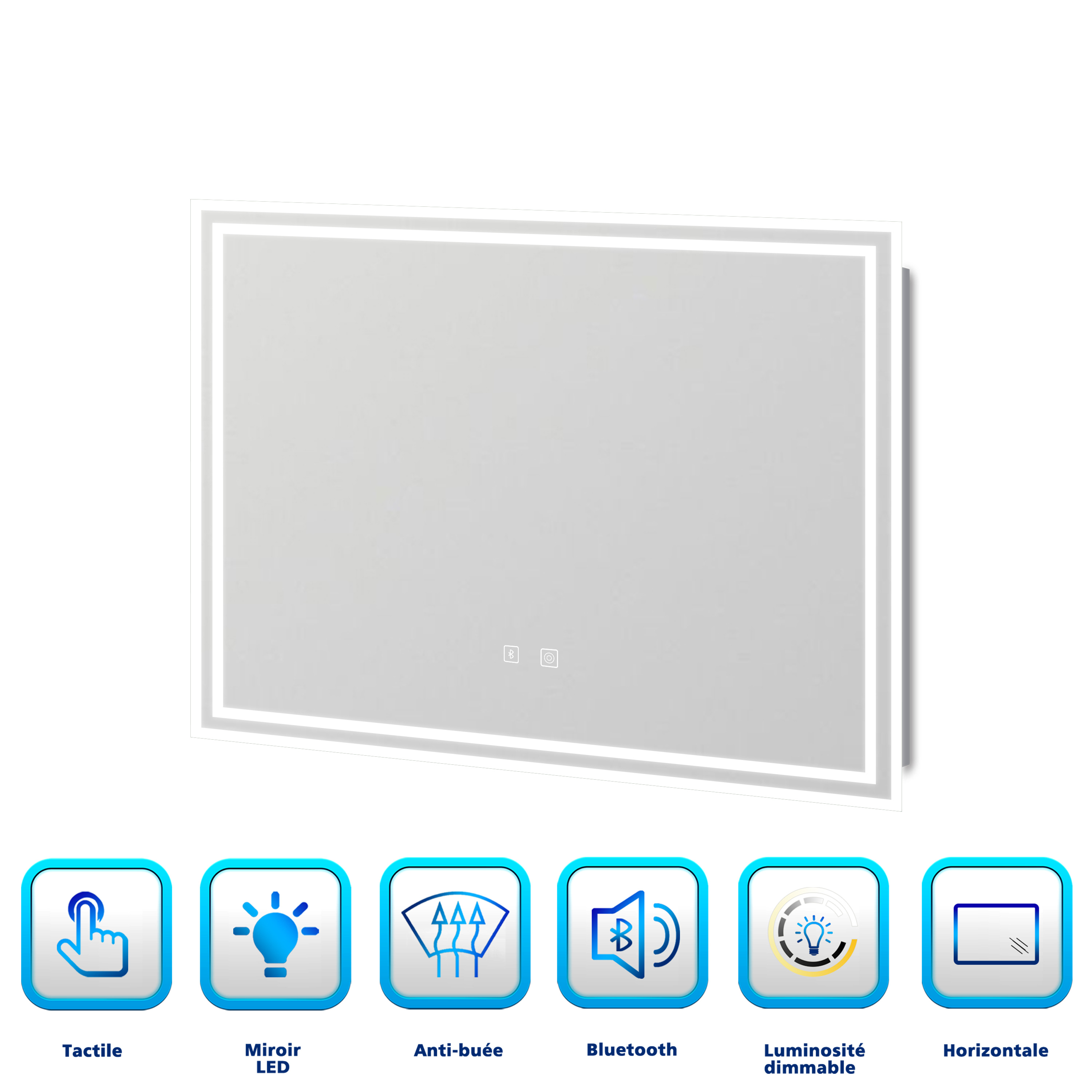 | Libellé | Miroir lumineux, 80 x 60cm avec Bluetooth + 3 couleurs + dimmable + anti-buée + fonction mémoire, miroir de salle de bain LED |