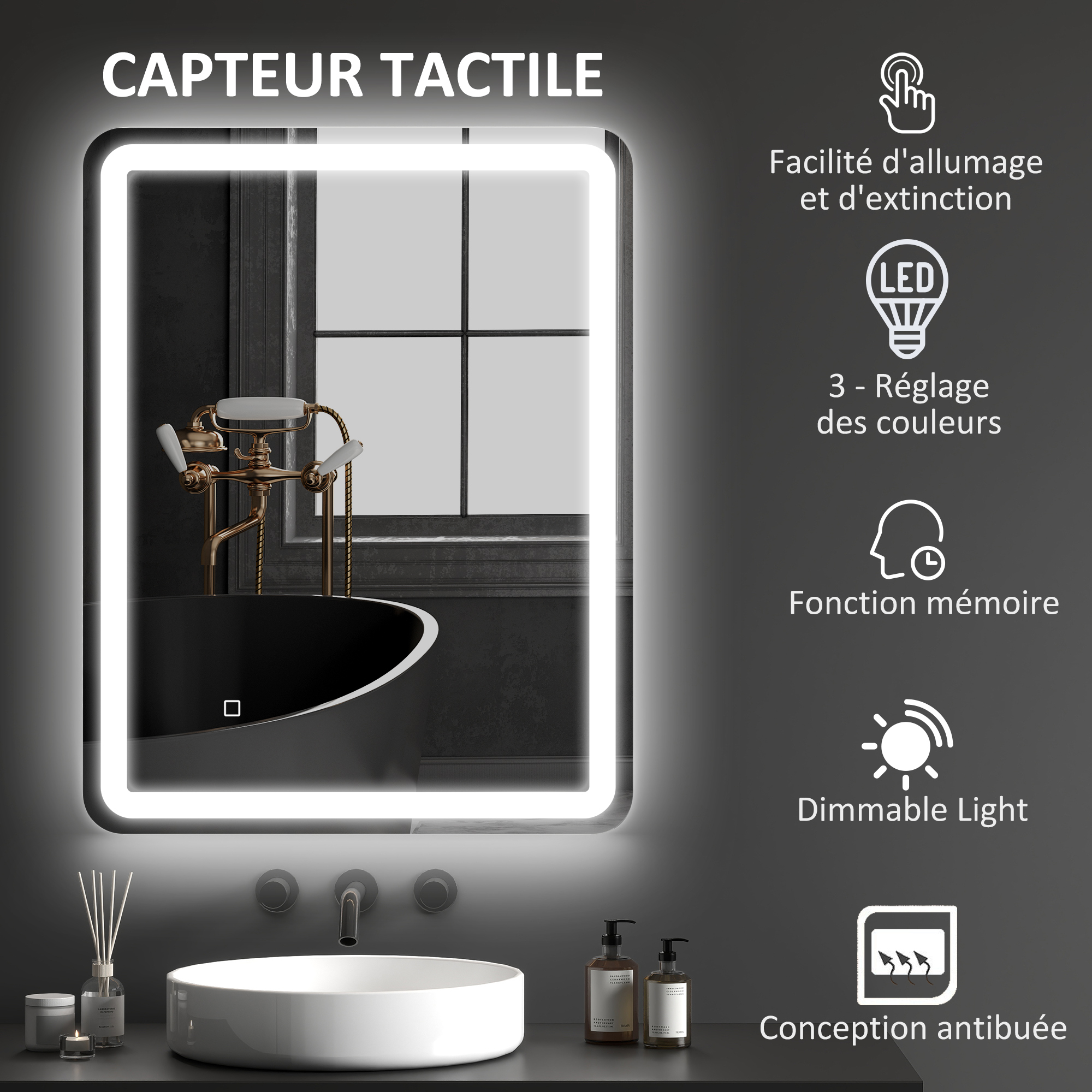 Miroir lumineux LED salle de bain 70 x 90 cm lumière réglable 3 couleurs fonction anti-buée et mémoire