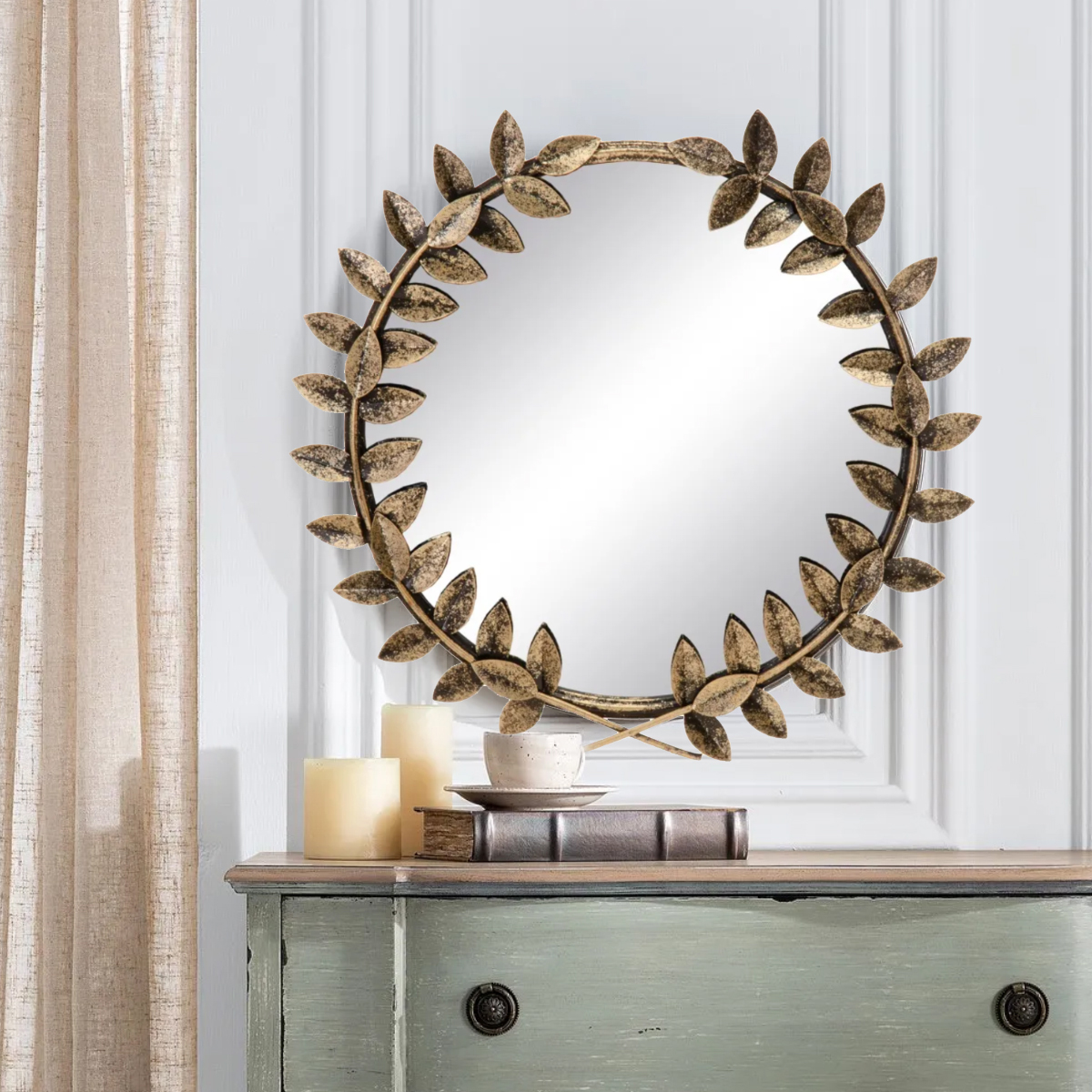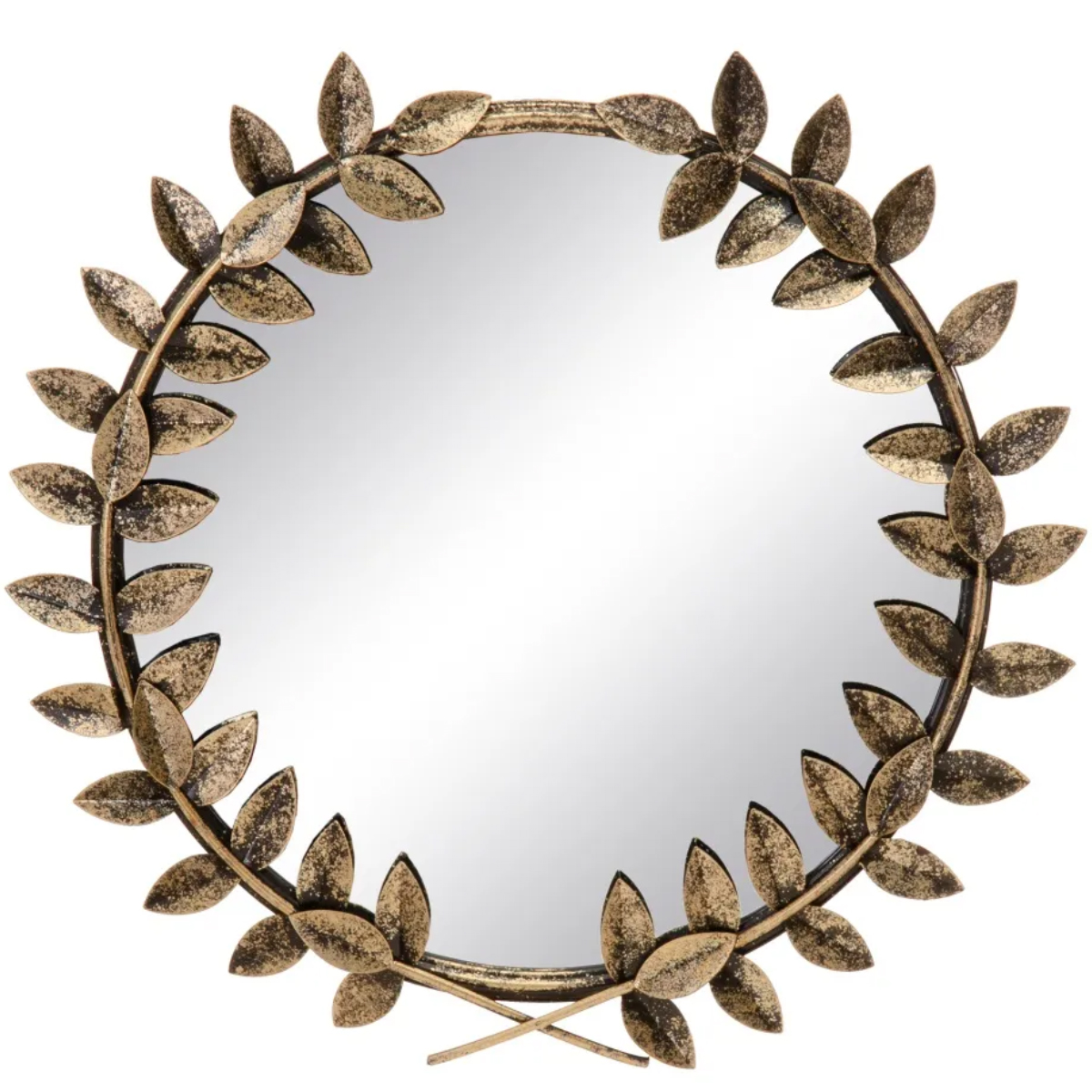 Miroir mural en métal doré patiné Métal A suspendre. Dimensions : Hauteur 45 cm - Largeur 45 cm - Profondeur 3 cm Dimensions de la partie miroir : 35 x 35 cm.