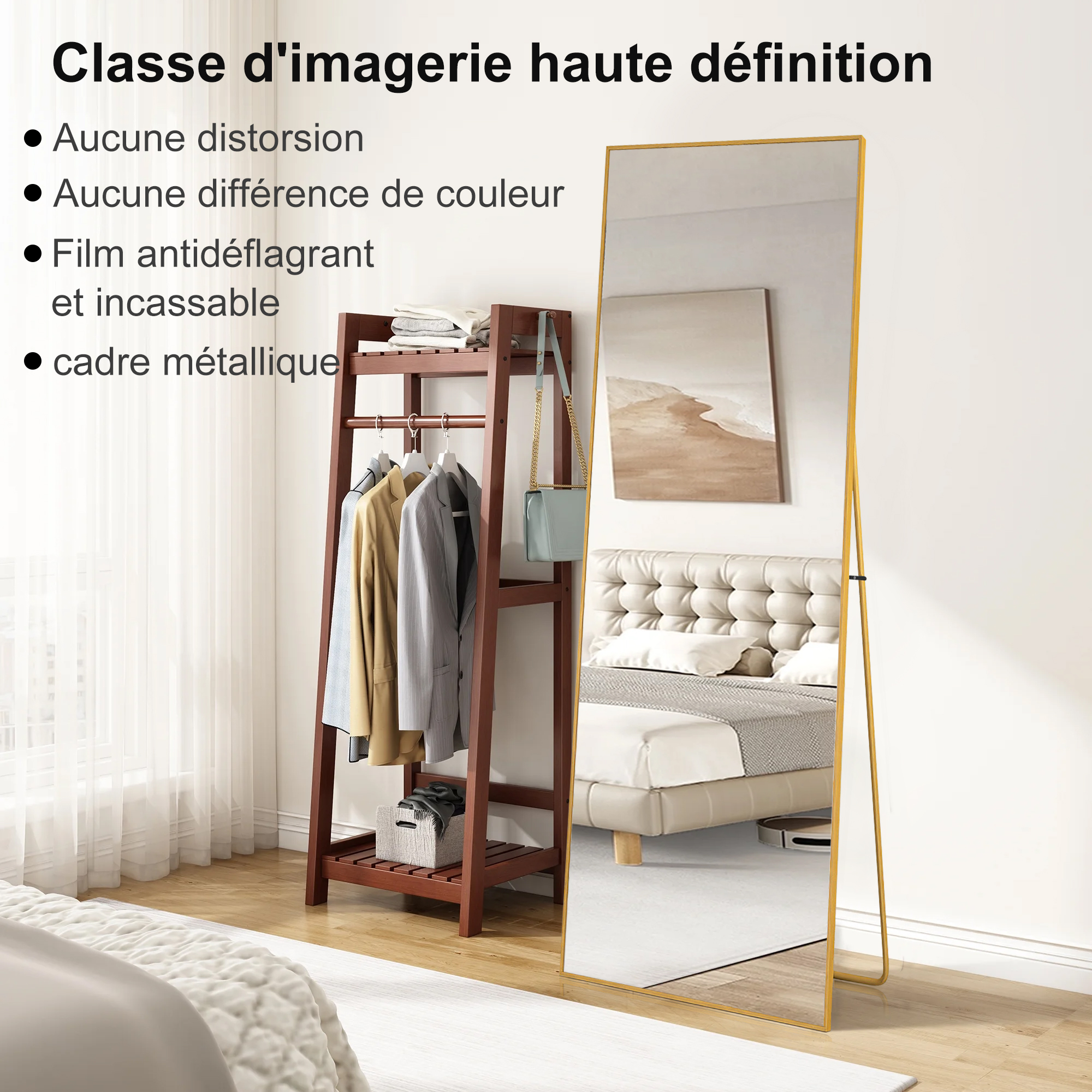 Miroir sur pied,173 x 63 cm, peut être fixé au mur ou posé au sol, cadre en alliage d'aluminium Doré
