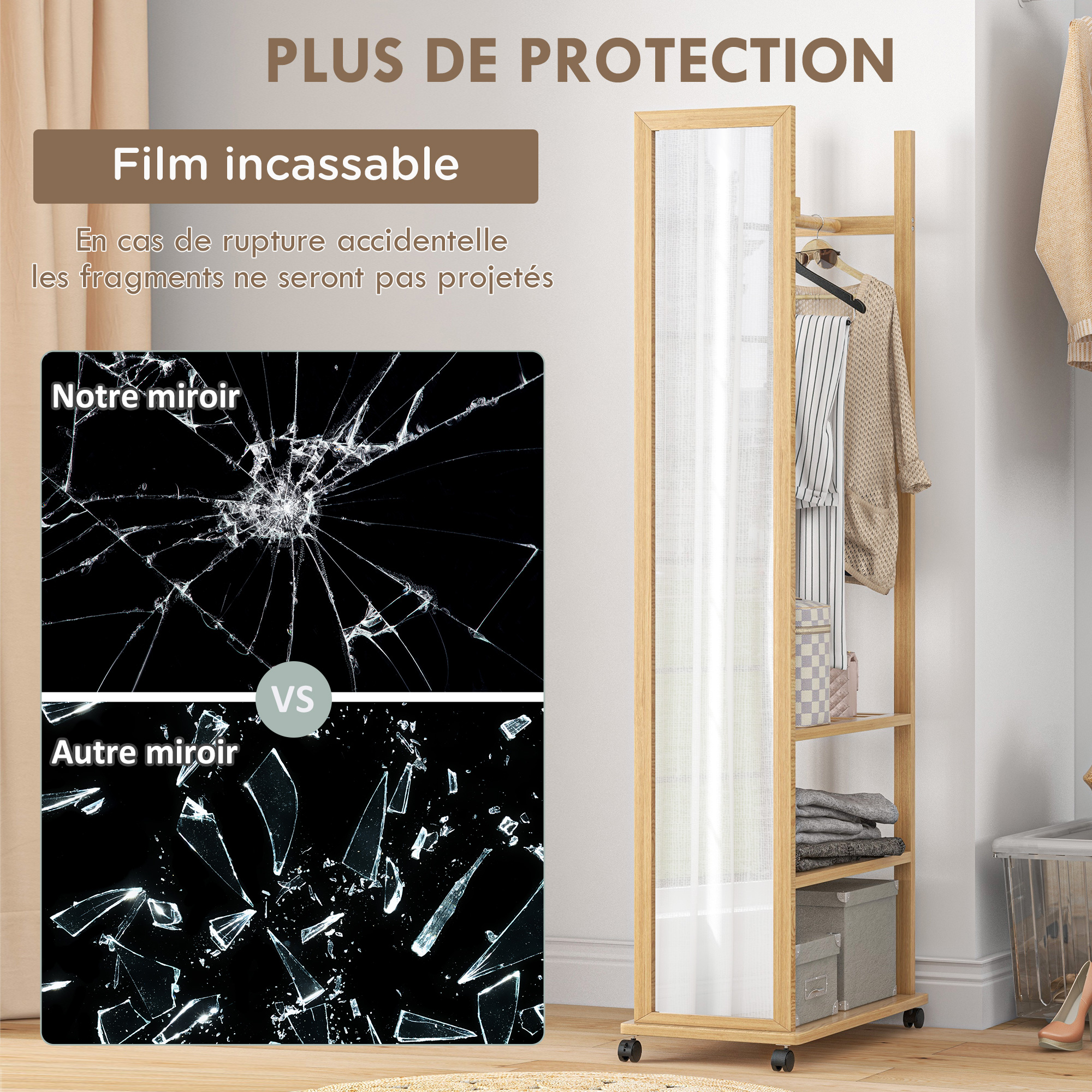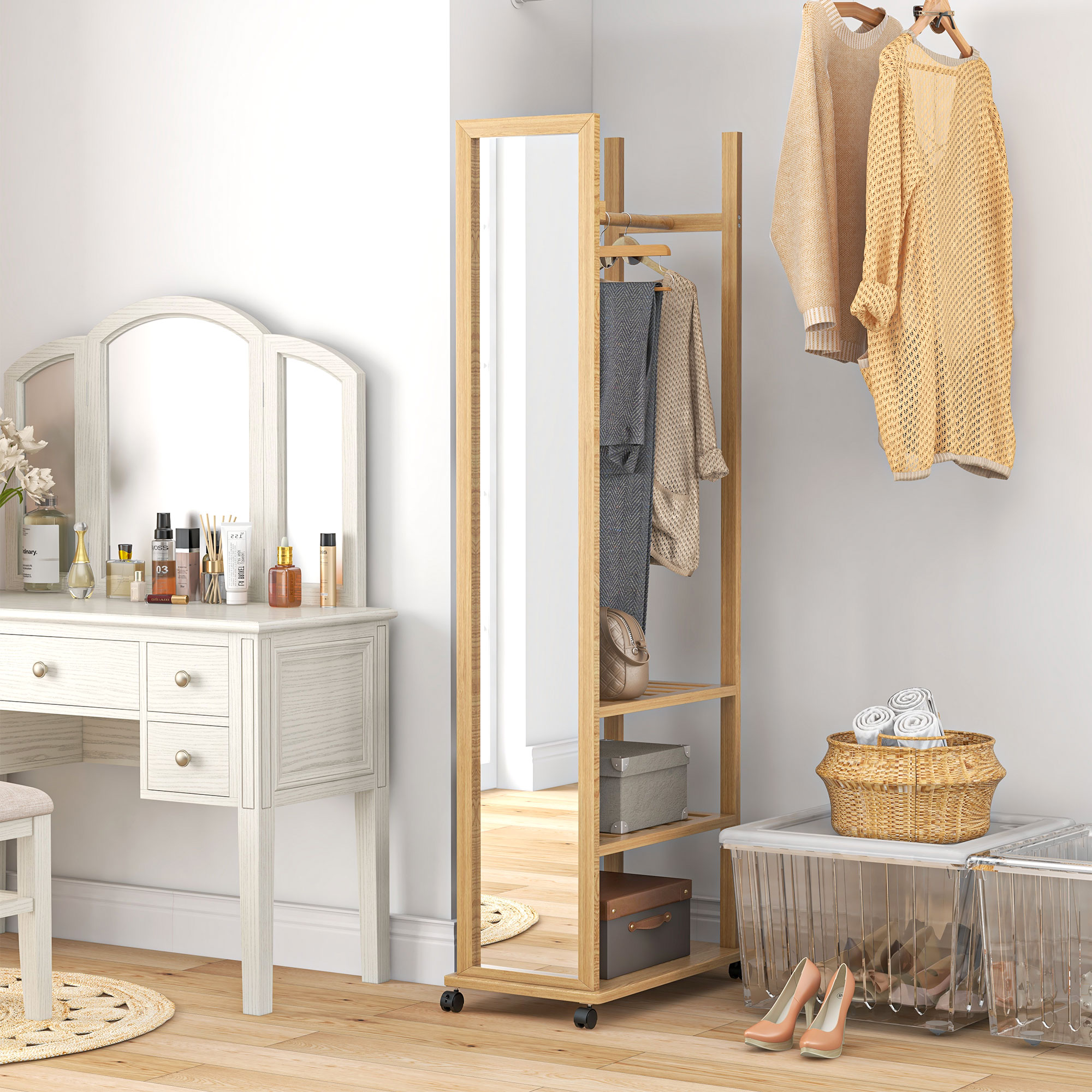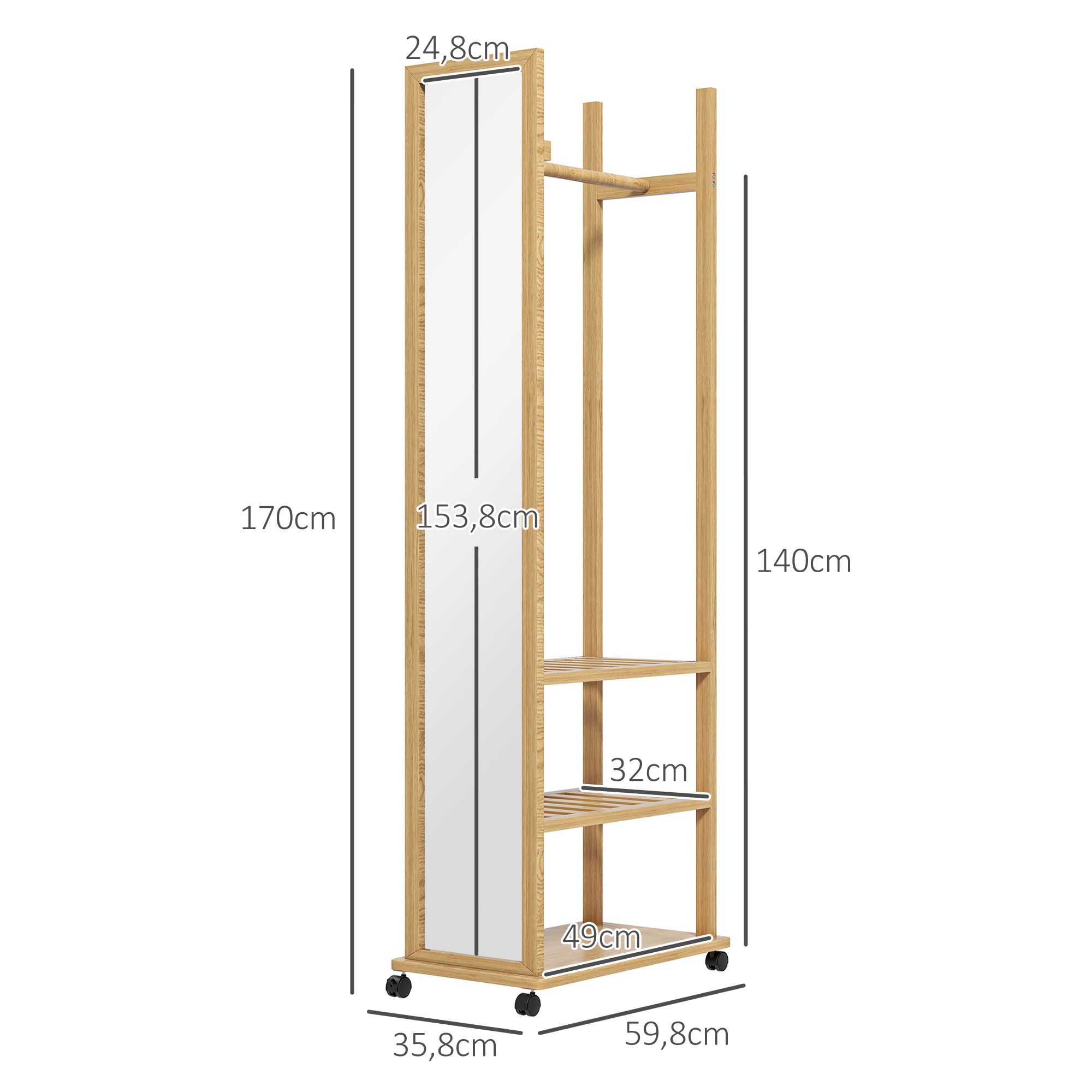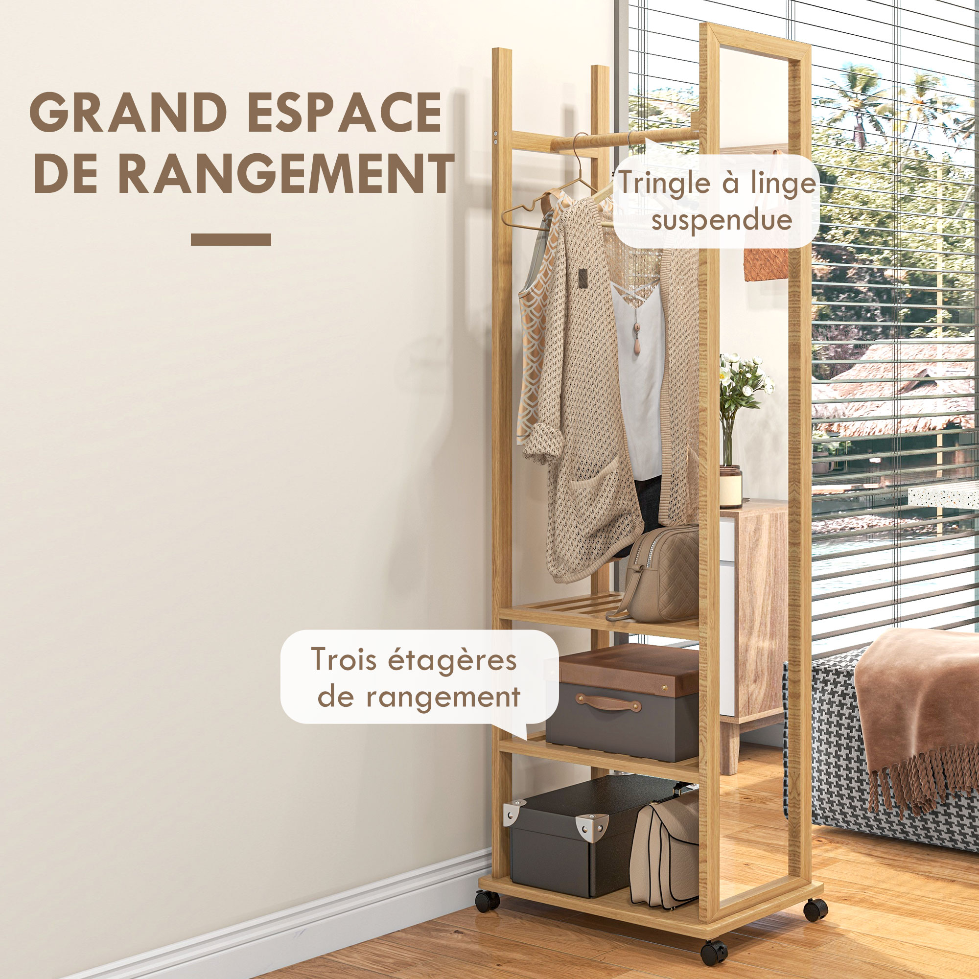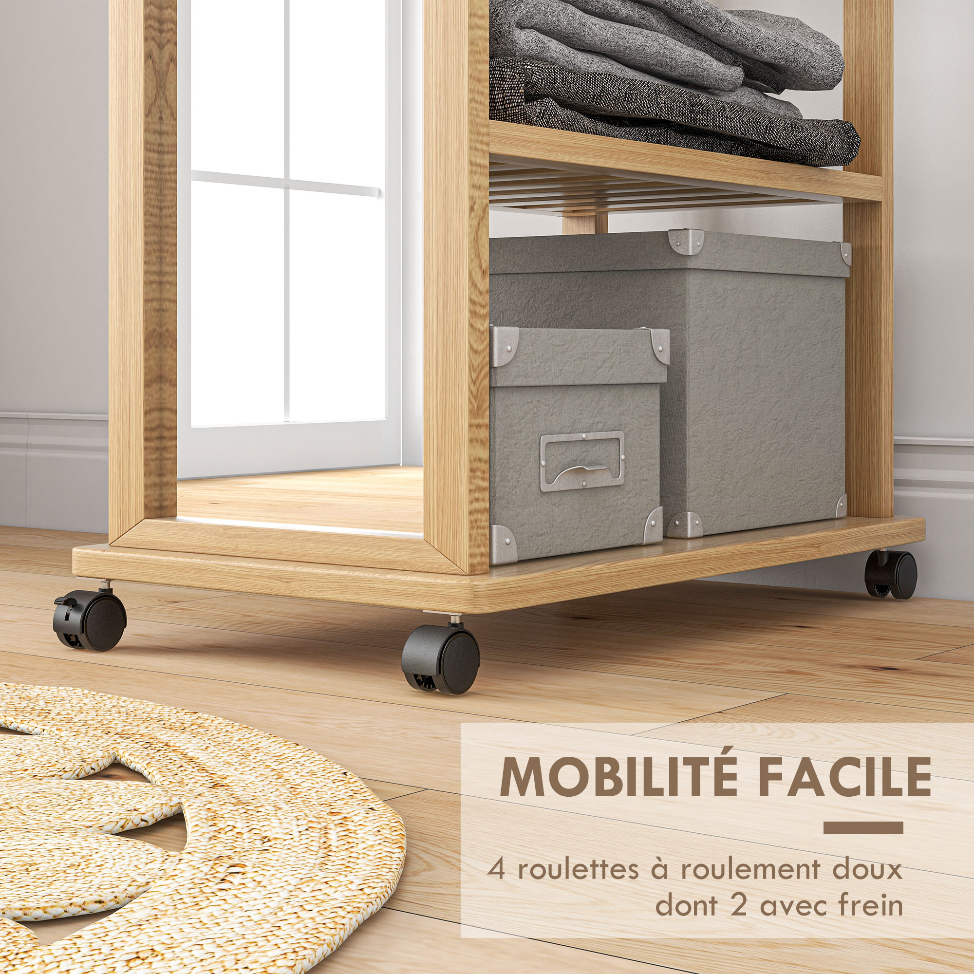 Mélant élégance et modernité, ce miroir sur pied avec roulettes équipé d'un portant et de 3 étagères en bois s'intégrera en parfaite harmonie dans votre chambre ou dressing.