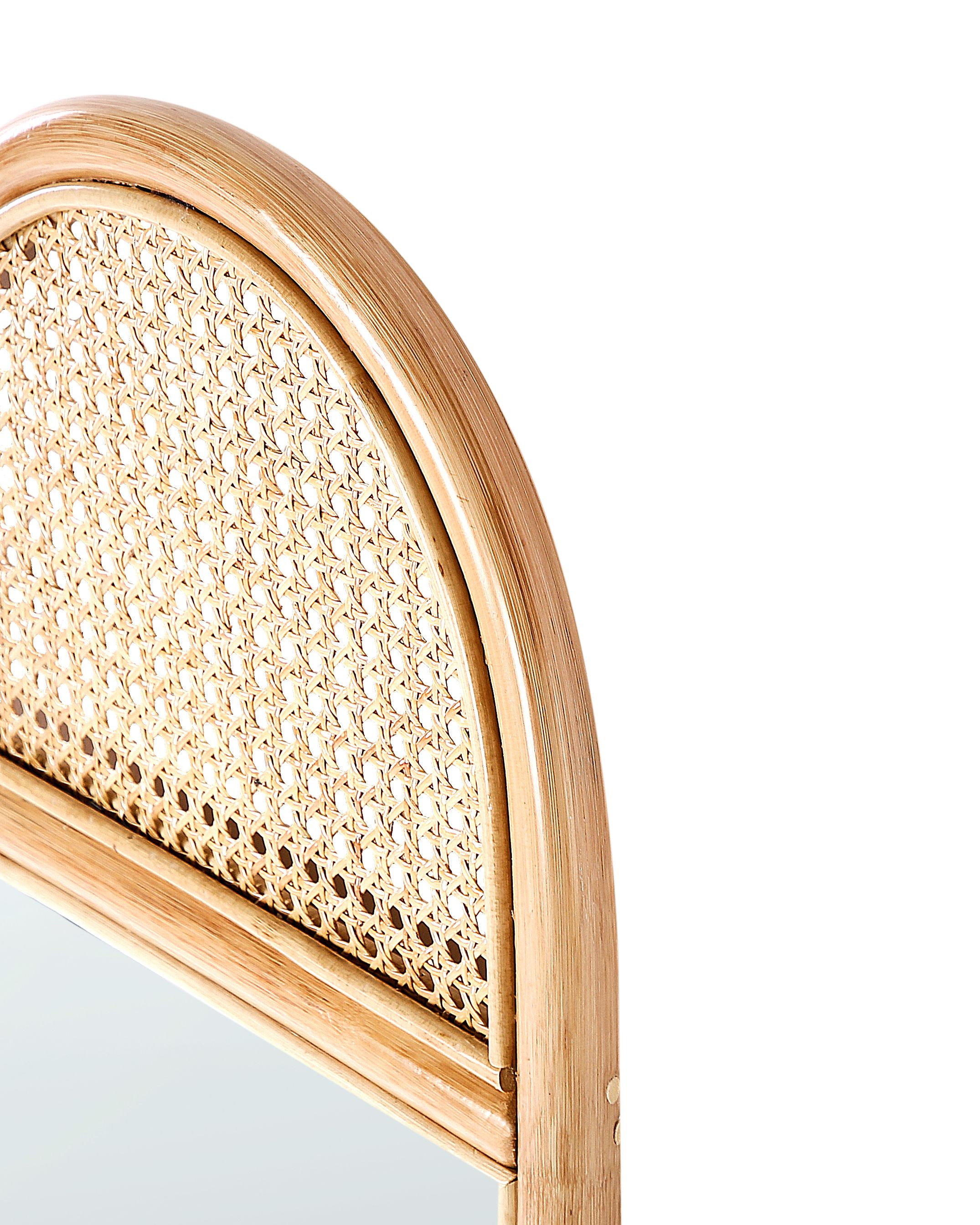 Miroir en rotin style boho. Donnez à votre intérieur une touche de charme bohème avec ce miroir sur pied. Son cadre fait à la main en rotin de haute qualité repose sur un pied robuste, ajoutant une touche accueillante à l'espace. Grâce à sa finition naturelle et neutre, le miroir s'intègre parfaitement dans un salon ou une chambre à coucher, en y apportant chaleur et convivialité.