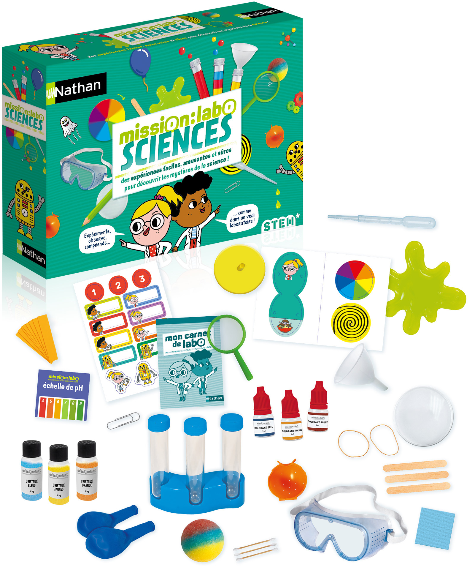| La boîte contient | 3 éprouvettes,1 porte éprouvette,1 loupe,1 boite de Pétri,1 toupie en plastique,1 pot de colle ,2 ballons de baudruche 1 pipette 3 bâtons mélangeur 1 moule à balle 3 sachets de cristaux 1 échelle de pH Bandes de papier indicateur universel pH 1 entonnoir Papier absorbant Cotons tiges Elastiques 1 trombone Calepin de laboratoire Feuille d’autocollants |