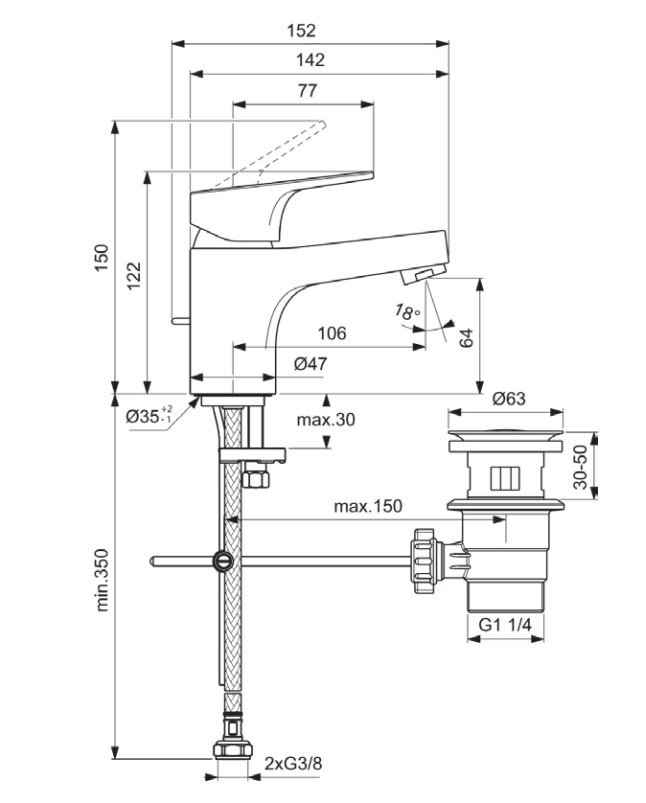Conçu pour une installation sur gorge, le mitigeur OLYOS présente des dimensions compactes avec une hauteur totale de 150 mm et une projection de 106 mm, s'adaptant ainsi à divers types de lavabos tout en apportant une touche contemporaine à la salle de bains.