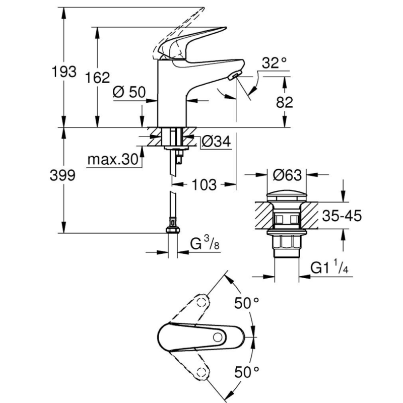 Les caractéristiques du mitigeur lavabo GROHE Swift avec vidage Push open chromé S :