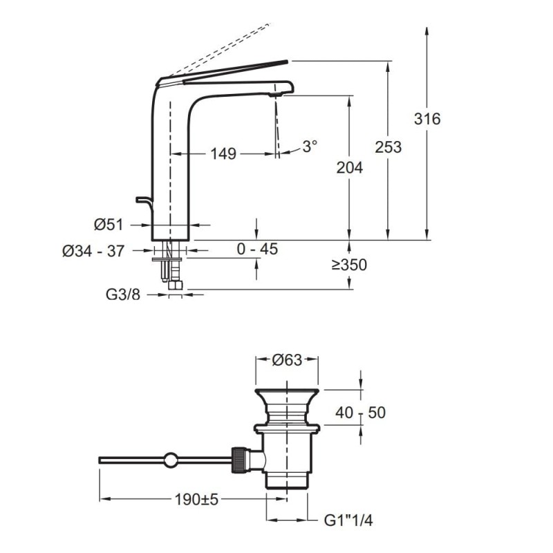 Hauteur max. (levier relevé au maximum) : 316 mm