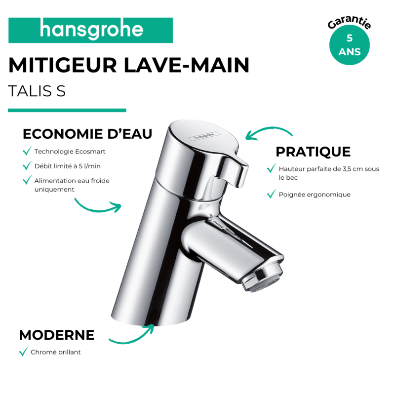 | Libellé | Mitigeur lave-mains HANSGROHE Talis S 40 sans tirette ni vidage chromé |
