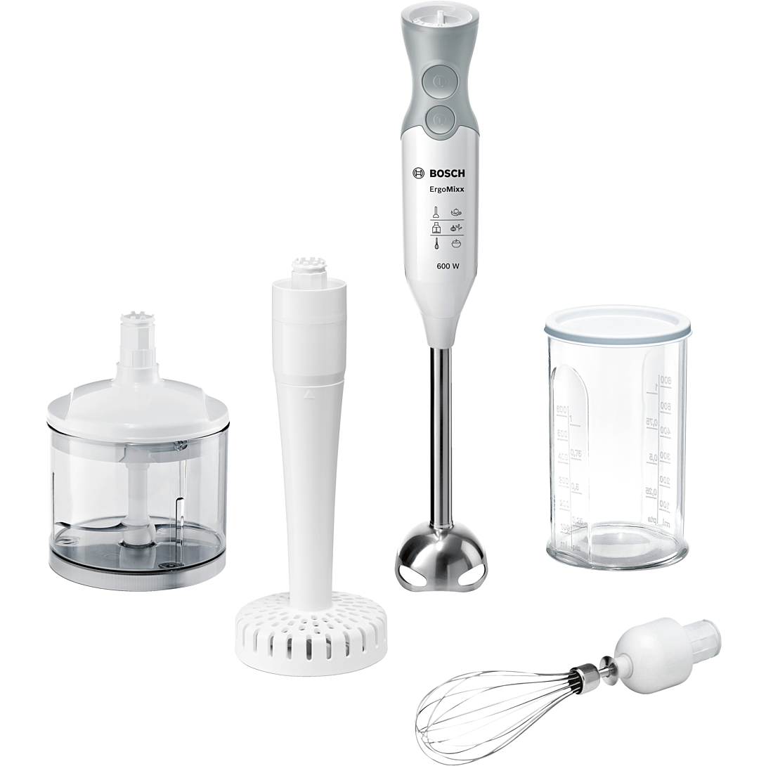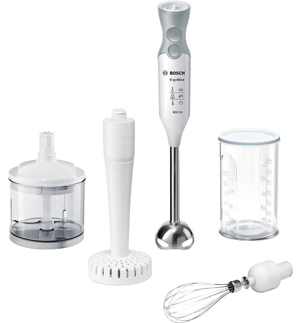 Mixeur plongeant - blanc / gris - Puissance : 600 Watt - Mixer puissant: 11200 t/mn - Excellente prise en main grâce au revê tement Soft-touch de la poignée, aux larges boutons et au design ergonomique - Moteur silencieux, léger et peu vibrant - Régulateur de 12 vitesses variables - Touche turbo pour une puissance optimale - Pied mixeur inox - Système innovant de 4 lames inox aiguisées pour des préparations onctueuses et homogènes en un clin d#oeil - Pied mixeur facilement amovible grâce au bouton d'éjection automat ique - Tous les accessoires peuvent être lavés au lave-vaiselle (sauf pièces moteur) - Gobelet doseur transparent et gradué - Mini-h achoir pour hacher les herbes, noix, oignons, viande, fromage... - Fouet en inox - Pied presse-purée pour réaliser de délicieuses pu rées de pomme de terre, ainsi que d#autres légumes cuits (carottes, brocolis, chou#).
