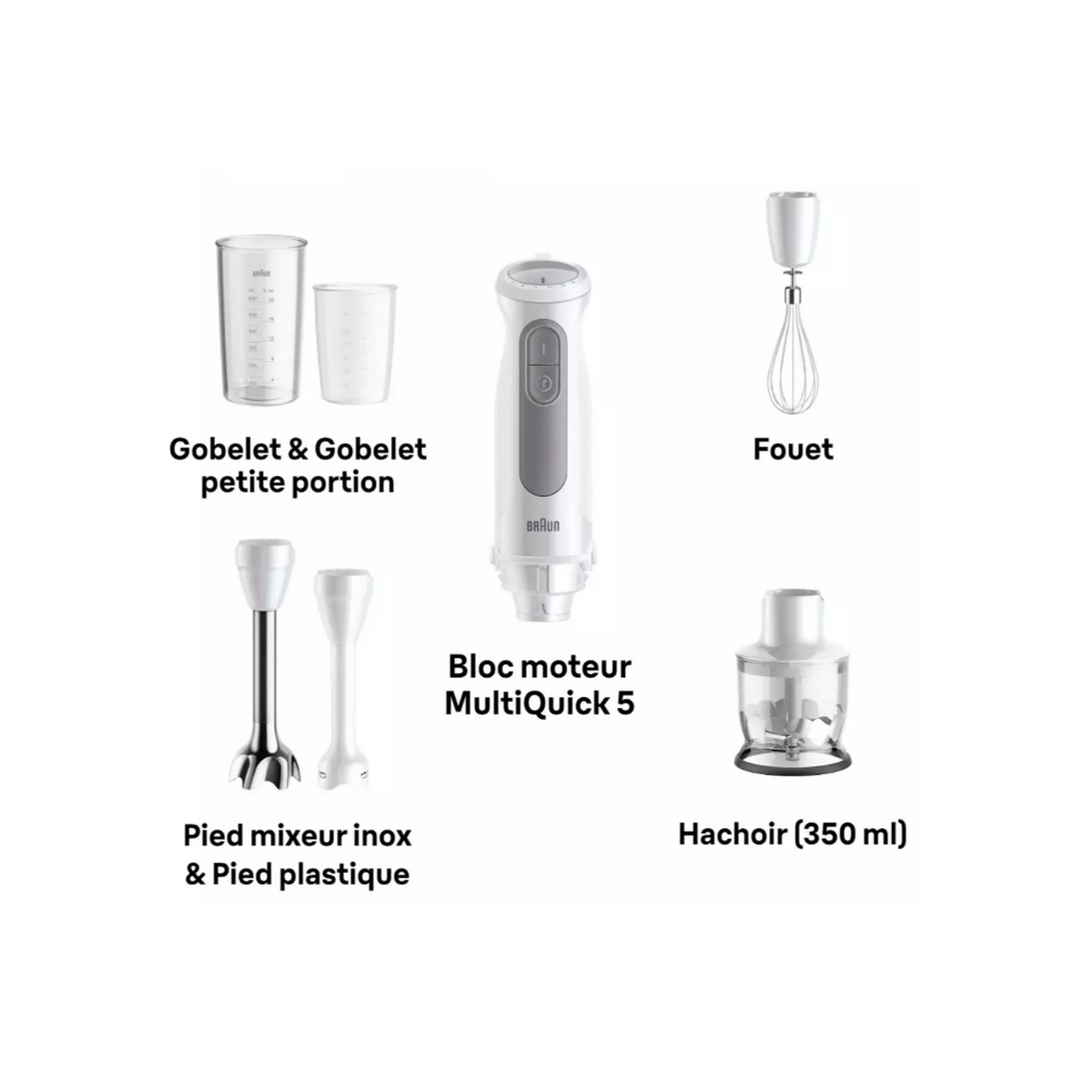 | Accessoires inclus | Pied mayonnaise, Fouet inox, Gobelet 250 ml, Gobelet 600 ml, Hachoir 350 ml |