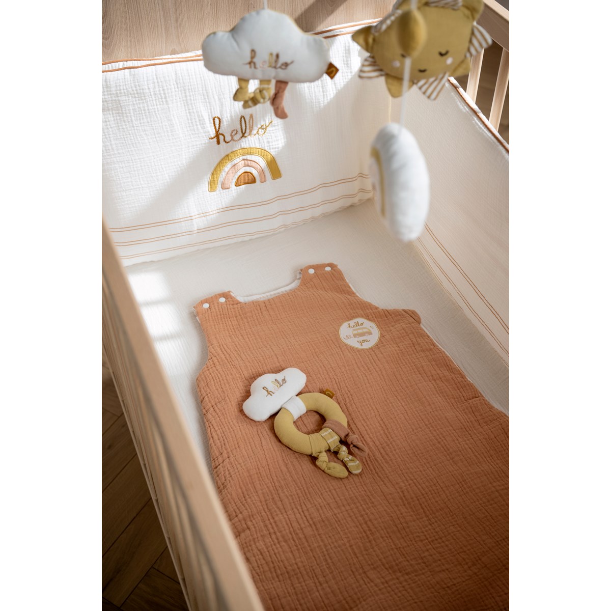 Le mobile Sunlight est destiné à stimuler l'ouïe et à éveiller bébé avec ses fruits. Objet de décoration en lui-même, il s'insèrera parfaitement dans la chambre tendance de bébé. La boite à musique (mélodie aléatoire) peut être remontée au dos du carillon et a un bouton marche/arrêt sur le côté qui peut arrêter la musique à tout moment. Instructions de montage fournies.