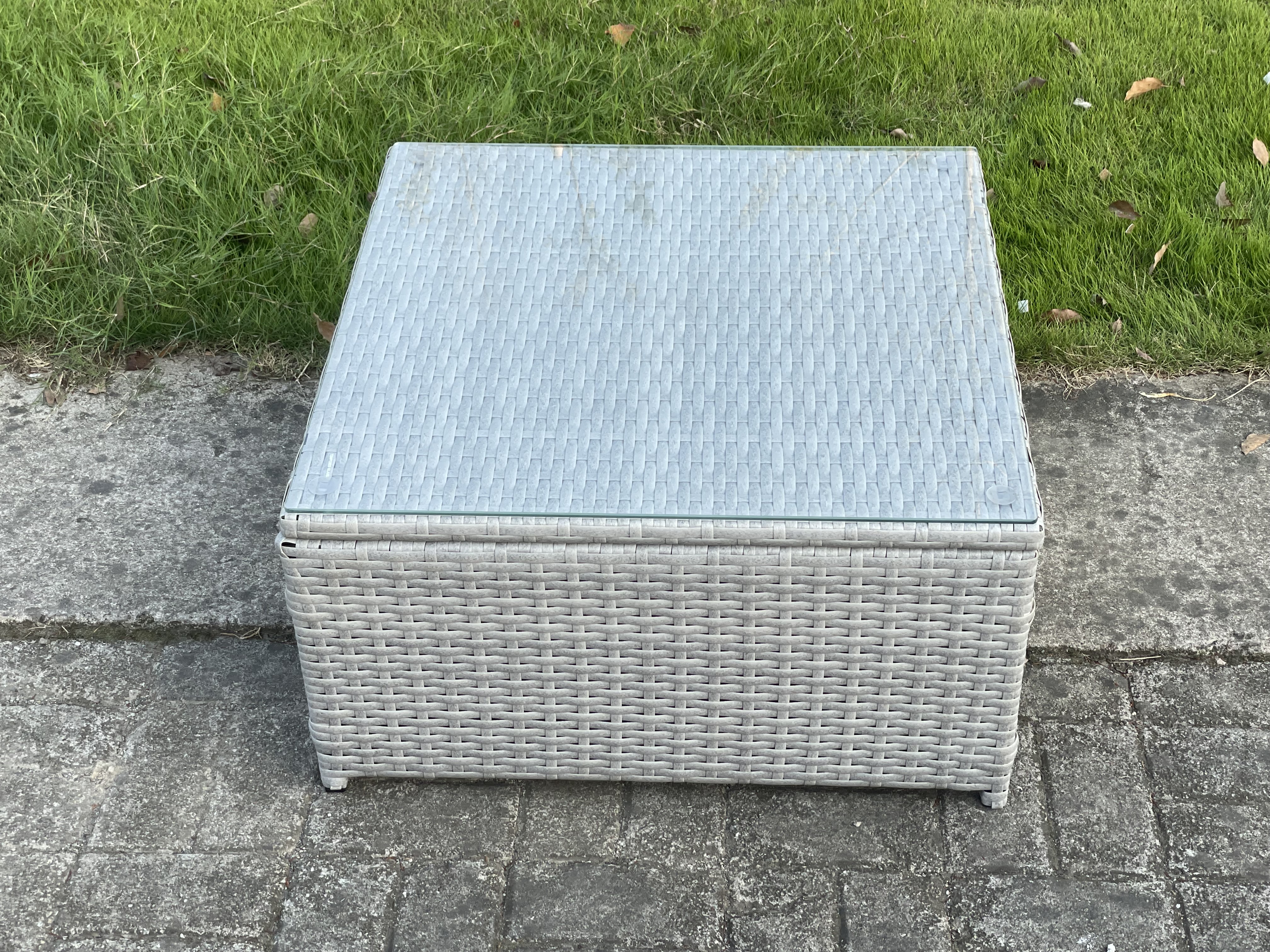 Taille: 65L x 65W x 34H cm Caractéristiques: •matériel:rotin PE, acier galvanisé, verre •Les articles sont emballés à plat et faciles à assembler •Rotin PE plat entièrement fabriqué à la main •Cadre en métal revêtu de poudre, robuste et durable •La vente directe d'usine garantit la qualité et le service après - vente. •1-year quality guarantee •Demande d'installation: Oui •Couleur : Gris Clair "