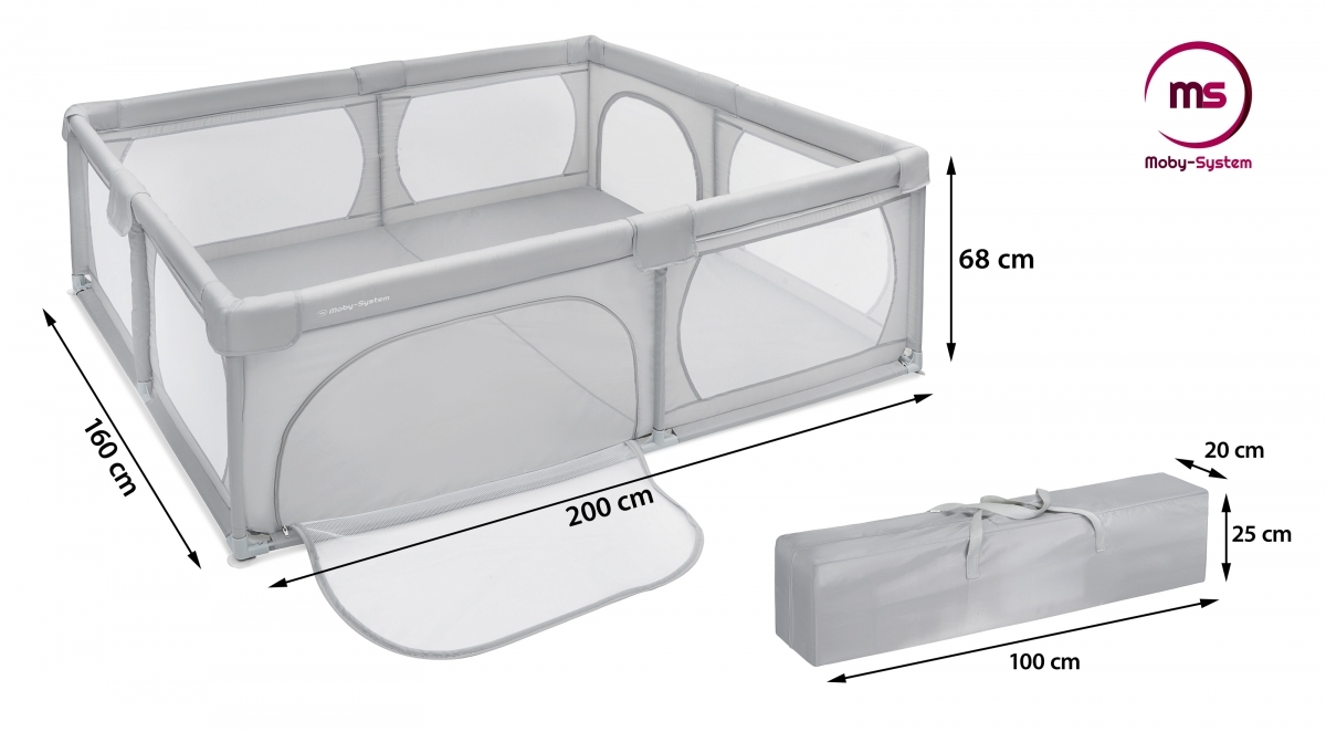 | Libellé | Moby-System Parc Bébé Pliable 200 x 160 X 68 cm, base antidérapante, grille de protection, matériau imperméable, sac transport, gris |
