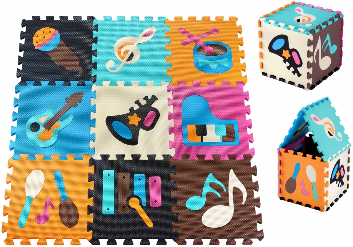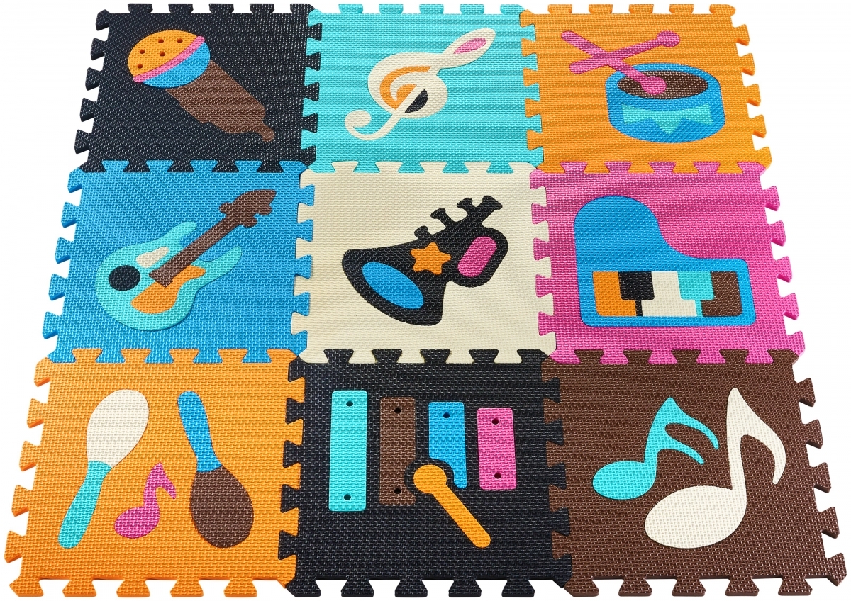 Casse-têtes en plusieurs pièces Chacune des 9 pièces se compose de deux parties : le véritable puzzle carré et la forme à l’intérieur, qui peut également être retirée. Les formes représentent des instruments de musique. Votre trésor peut s’assoir jouer ou ramper tout en apprenant et en restant protégé du sol.