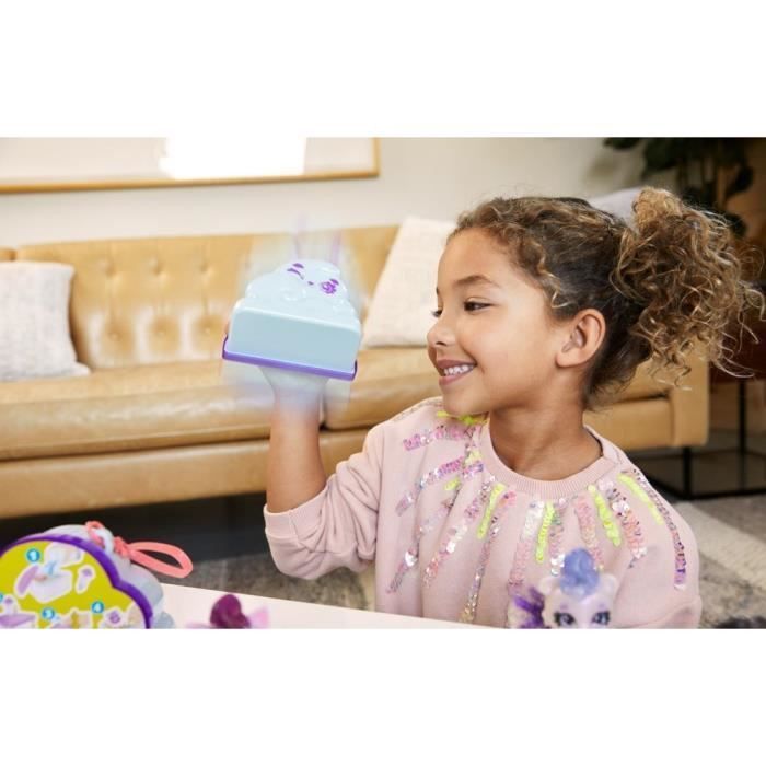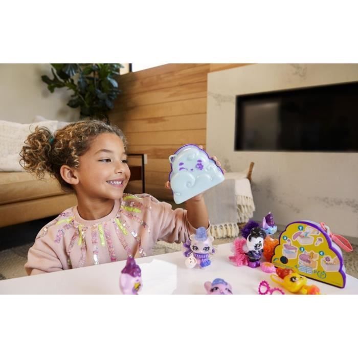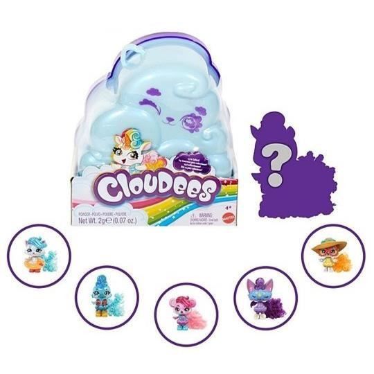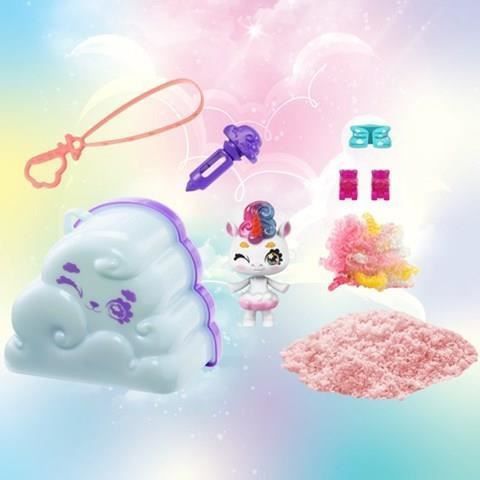Ce coffret nuage inclut six surprises dont un sachet pour créer le nuage, deux accessoires, un animal de 7,5cm de hauteur et un dépliant des modèles à collectionner. Le nuage poudreux apparaît avec un peu deau en secouant le mélange.Le coffret peut s'accrocher pour le transporter.