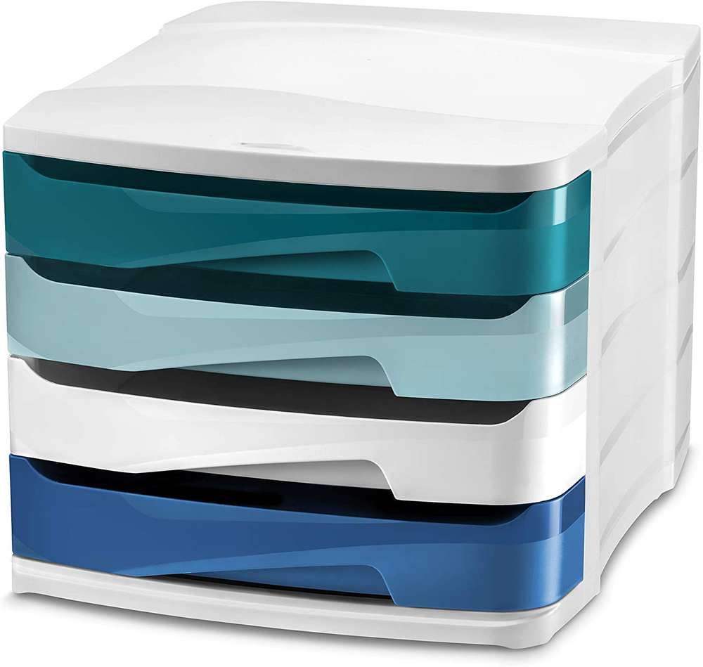 CEP - Module de classement "Riviera" - 4 tiroirs - Blanc / bleu . Elégant bloc de classement 4 tiroirs caractérisé par une façade asymétrique. Les tiroirs très larges acceptent les documents jusqu'au format 24 x 32 cm et les pochettes à élastique. Equipés d?un trou de préhension pour saisir le contenu et d'une butée d?arrêt pour éviter le décrochement. Capacité utile d'un tiroir : 333 x 250 x H 44 mm, soit 450 feuilles. Superposable. Patins antidérapants fournis. Dim. hors tout : 292 x 386 H 246 mm. PS résistant, 100% recyclable..