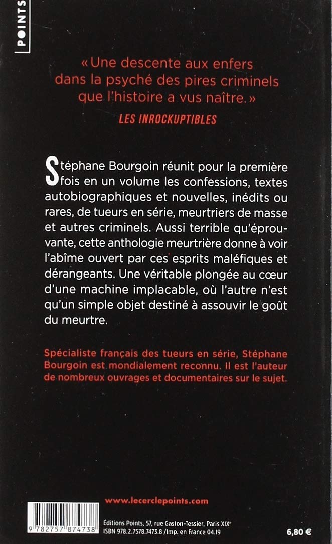 Afin de comprendre le fonctionnement psychologique des tueurs en série, Stéphane Bourgoin a interviewé des dizaines de criminels. Douze serial killers détaillent ici dans des nouvelles, des textes autobiographiques, inédits ou rares, leurs fantasmes meurtriers les plus sanglants et dérangeants. Dans le couloir de la mort, Carl Panzram n’a aucun regret. Il a tué vingt-et-une personnes, en a violé des milliers. Fritz Haarmann mordait ses victimes pour les tuer, avant de découper leurs cadavres. Elliot Rodger a massacré la population d’Isla Vista pour se venger des femmes qui refusaient de s’offrir à lui.