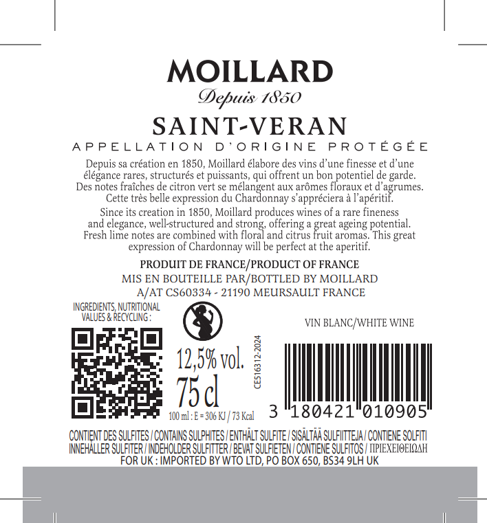 | Libellé | Moillard Les Marnes, 2023 - Saint-Véran AOP - Blanc Sec - 75 cl |