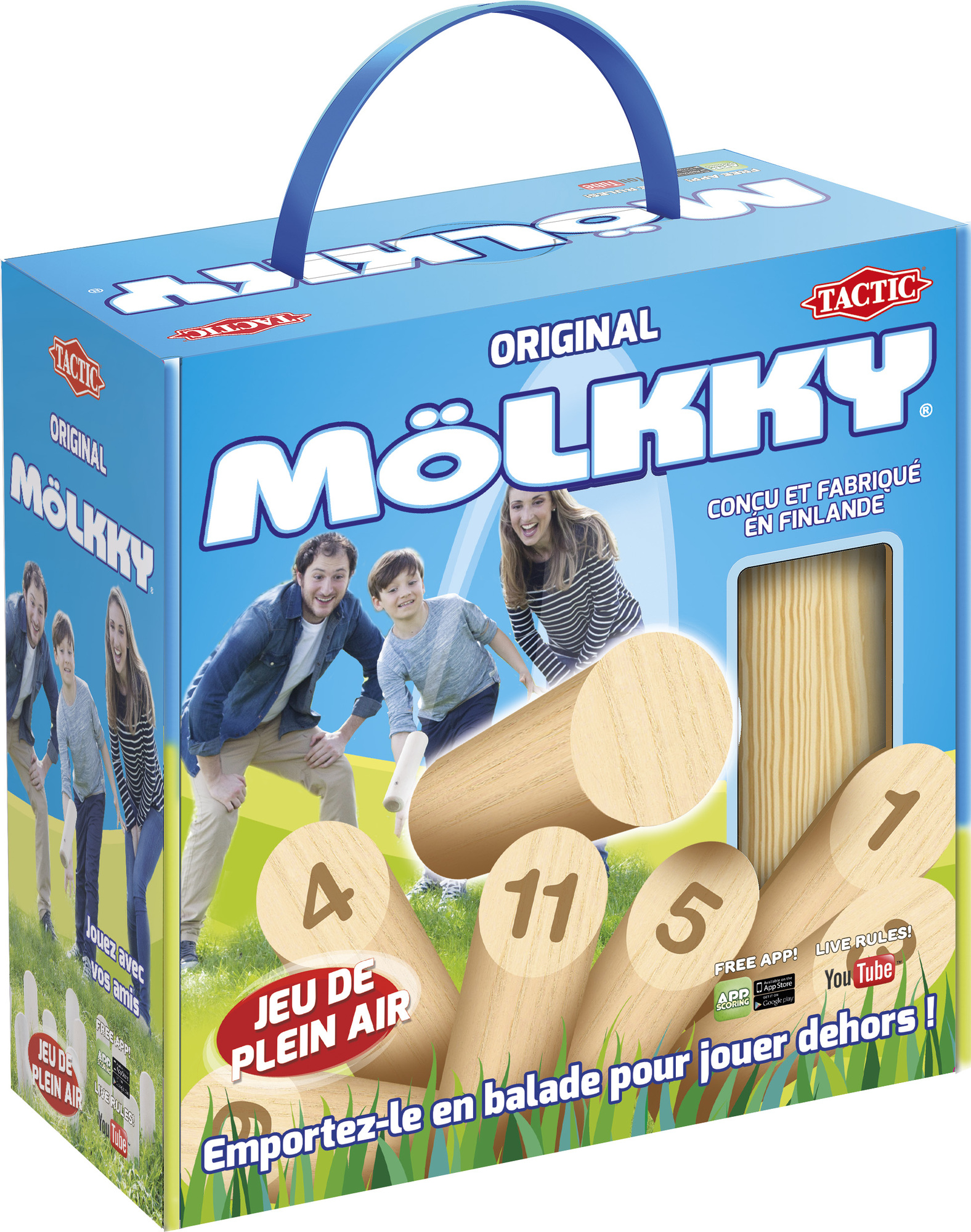Prononcez MEUL-KU ! Devenez adepte du Mölkky ce jeu de plein air, jeu de lancer très populaire en Finlande qui combine adresse, tactique et chance et s’apparente à la fois aux jeux de pétanque, de billard et de bowling. C’est très simple, et très convivial, soyez le premier à atteindre 50 points exactement et c’est gagné. Lancez le Mölkky en essayant de renverser les quilles numérotées. Si vous faîtes tomber une seule quille, vous marquerez la valeur de la quille. Et si vous renversez plusieurs quilles, vous marquerez un nombre de points correspondant au nombre de quilles tombées. Mais ne dépassez pas 50 points sinon votre score redescendra à 25 points !