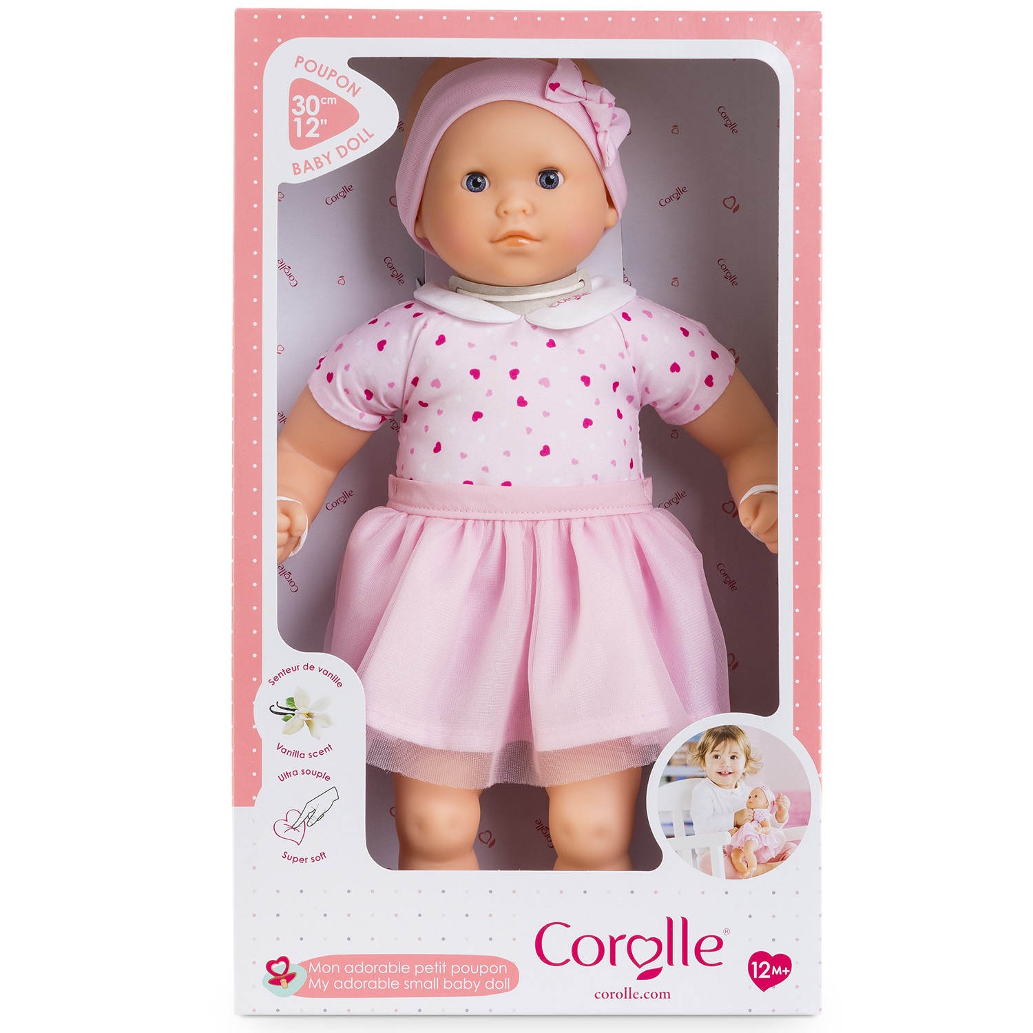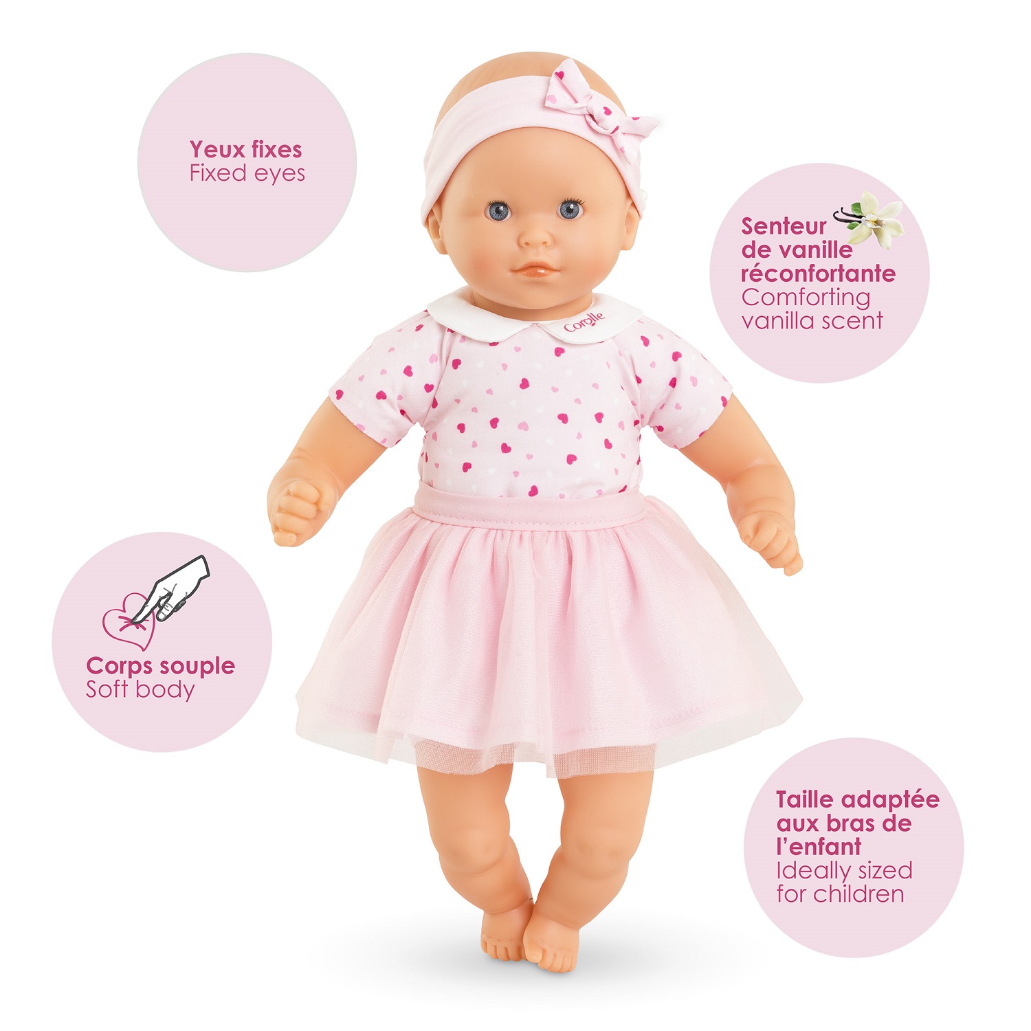 Un concentré de douceur et de réconfort pour les tout-petits ! Avec sa taille idéale de 30 cm, Mon Adorable Petit Poupon Cœurs est parfaitement adapté aux bras et aux petites mains des enfants dès 12 mois. Léger et souple, il se manipule facilement, offrant des heures de câlins et de jeu. Son visage réaliste, ses bras et ses jambes en vinyle doux au toucher, délicatement parfumés à la vanille, apportent une touche sensorielle unique. Ses yeux fixes bleus, pleins de charme, éveillent la complicité et la tendresse. Un look irrésistible : Mon Adorable Petit Poupon Cœurs arbore un joli tissu imprimé de petits cœurs roses, un col claudine raffiné orné du logo Corolle et un tutu en tulle amovible. Son bandeau assorti vient parfaire cette tenue empreinte de douceur. Grâce à sa collection de vêtements et d'accessoires, spécialement conçus pour la gamme mon Premier Poupon Corolle, votre enfant pourra s'initier aux joies du jeu d'imitation et prendre soin de son poupon comme un vrai bébé. Dès 12 mois – Un premier poupon idéal pour accompagner les premiers moments de jeu et de tendresse. Un cadeau parfait pour faire briller les yeux des tout-petits ! Mon Adorable Petit Poupon Coeurs ne peut prendre de tétine dans sa bouche. Pour des raisons de conditionnement, la jupe a été fixés par des points de couture au corps du poupon. Il convient de les couper délicatement pour profiter pleinement et séparément du poupon, et de sa jupe. Ainsi votre enfant pourra jouer à habiller et déshabiller son poupon à loisirs.