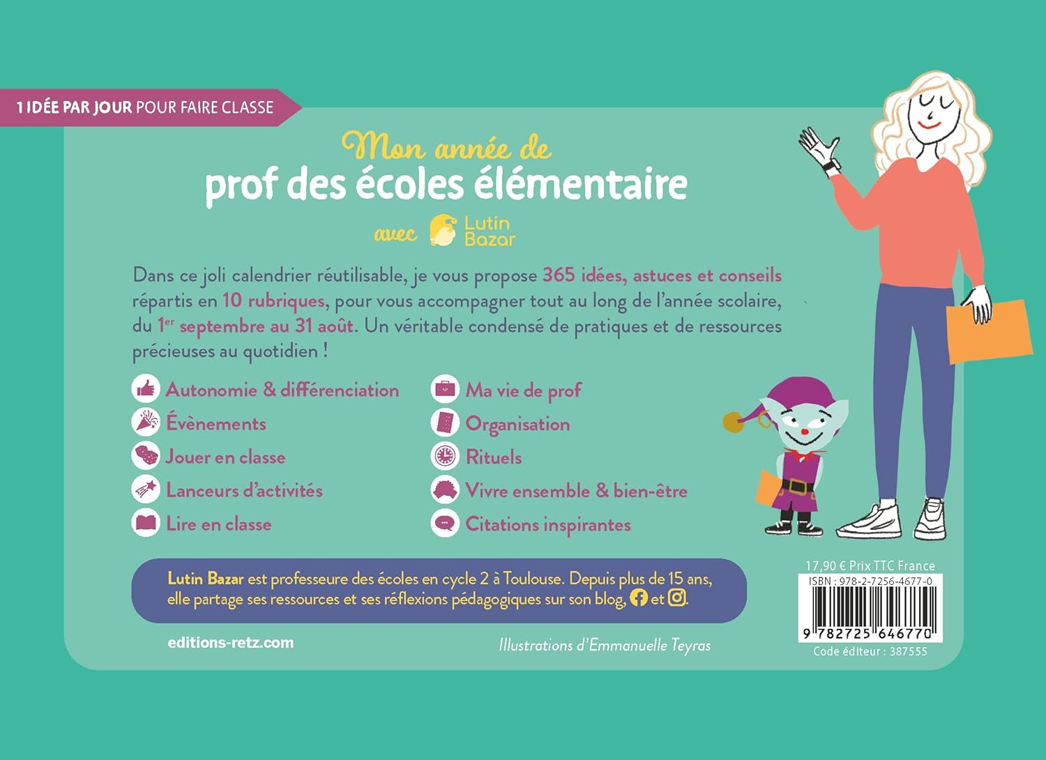 365 conseils, rituels pédagogiques et idées inspirantes de Lutin Bazar pour faire classe en élémentaire, dans un calendrier chevalet joliment illustré que vous pourrez réutiliser chaque année.