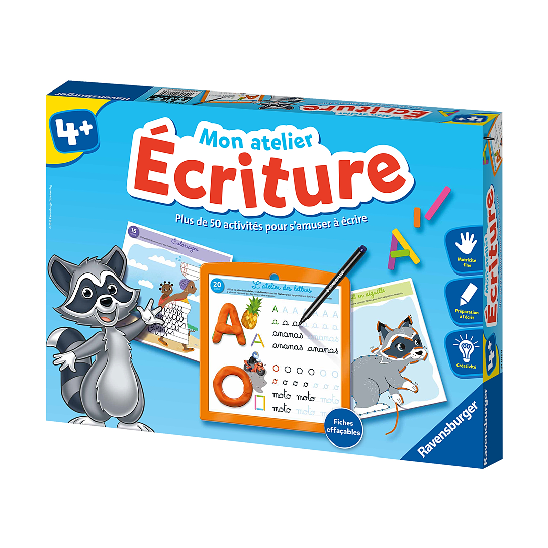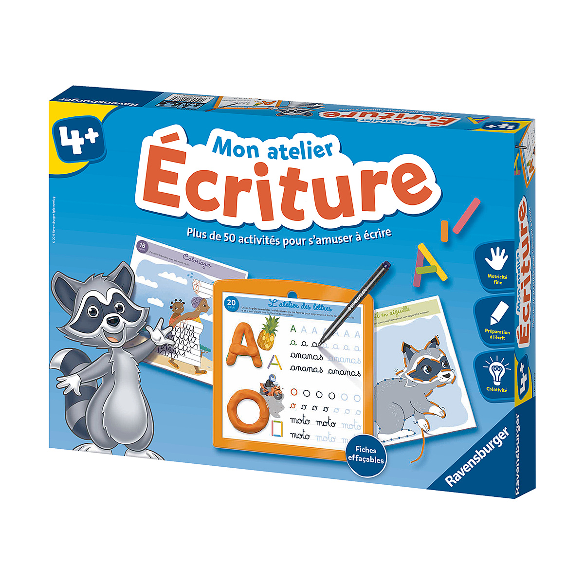 | Plus produit | Plus de 50 activités pour s\'amuser à écrire ! Conçues avec des enseignants et inspirées de la pédagogie Montessori, les activités favorisent les expériences de manipulation et le jeu en autonomie. Grâce à un système astucieux de planches à onglets numérotés, les enfants découvrent la richesse des activités et des thématiques. L\'atelier Ecriture rassemble dans un coffret plus de 50 activités ludiques, originales et créatives, pour initier lenfant aux gestes de lécriture tout en s\'amusant ! Ce jeu favorise la motricité fine, la préparation à l\'écriture et la créativité. Ce format à été pensé pour être simple à ranger ! Les enfants découvrent un matériel riche, coloré, un système astucieux de fiches numérotées et des illustrations joyeuses. Au fil des fiches, les enfants perfectionnent l\'apprentissage de l\'écriture avec différentes activités : les graphismes, les coloriages, l\'atelier des chiffres, la dictée muette, entre les lignes... Contenu: 1 support, 24 fiches effaçables (recto verso), 1 feutre effaçable, 1 éponge, 4 planches à trous, 3 lacets, 1 rouleau de pâte à modeler, 42 bâtonnets, 10 feuilles, 1 notice. Ce produit est composé de matériaux issus de forêts bien gérées certifiées FSC®, de matériaux recyclés et de matériaux issus dautres sources contrôlées (FSC-C111262). Ce coffret s\'accompagne d\'une collection entière pour les enfants dès 4 ans. Le coffret \'Premiers mots\' ou \'le jeu du corps humain\' avec un appareil radiologique pour tout connaitre sur le corps humain. Retrouver pour chaque âge de 2 à 5 ans une multitude de jeux basés sur les notions essentielles et sur des connaissances à acquérir. |