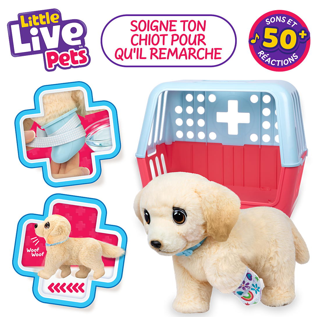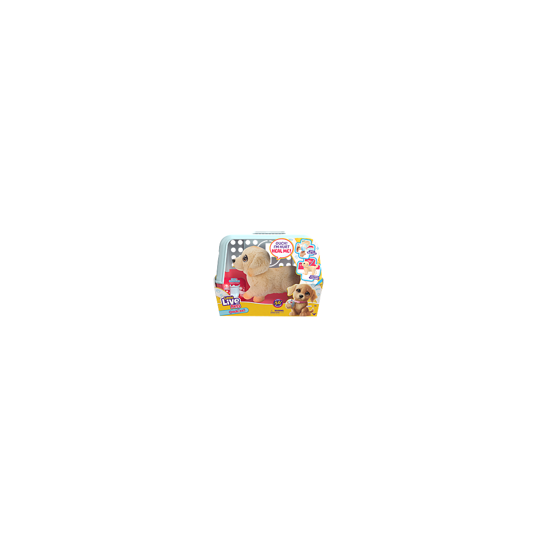 "Ce pauvre petit chiot s’est fait mal à la patte, caresse-le et soigne-le pour le rendre heureux ! Cette peluche interactive imite à la perfection un petit chiot à la patte cassée. Il marche sur 3 pattes tout en boitant de manière touchante… à toi de le soigner en lui mettant un plâtre. Une fois guéri, regarde-le marcher joyeusement sur ses 4 pattes ! Avec + de 50 sons et réactions, il réagit à tes caresses, marche et aboie comme un vrai chiot ! Amuse-toi à décorer son plâtre en dessinant dessus !"