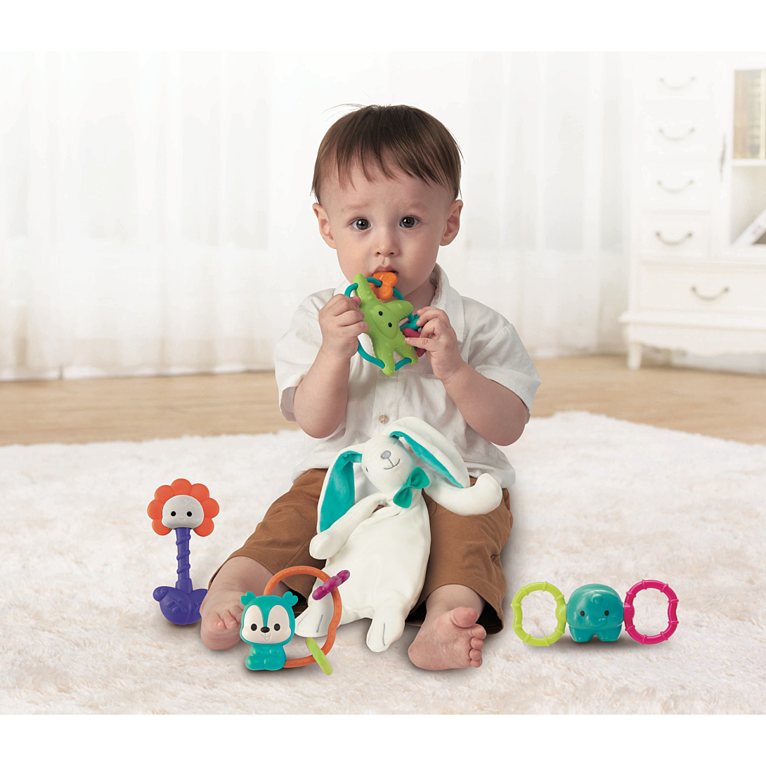 Le coffret cadeau idéal pour les enfants dès la naissance ! Il contient une peluche lapin toute douce de 30 cm de haut et 5 hochets et anneaux de dentition.