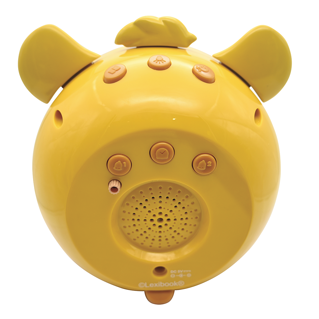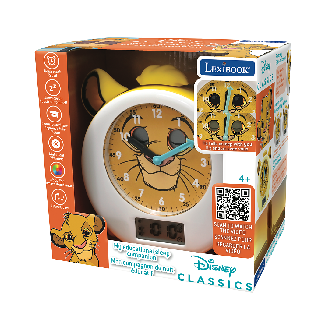• Compagnon de sommeil Simba pour apprendre à bien s’endormir. • Conteur d’histoires ! + de 60 histoires et mélodies pour s’endormir en douceur. • Double alarme avec choix de sonneries et de leur volume. Avec fonction sieste et retardateur. • Coach de sommeil parlant : il ferme les yeux quand c'est l'heure de dormir et les ouvre quand il est l'heure de se réveiller ! • Fonction sieste : appuyez sur un seul bouton pour activer le mode sieste pour une période donnée de 15 à 120min ! • Lampe d’ambiance multicolore, le réveil devient veilleuse et simulateur d’aube pour se coucher et se réveiller sereinement ! • Double affichage digital et analogique pour faciliter l’apprentissage de l’heure. • Un compagnon super attachant ; il fait des sons rigolos et a un design super mignon. • Facile d’utilisation : il suffit d’appuyer sur ses oreilles pour changer d’histoire, de mélodie ou d’ambiance lumineuse ! • Alimentation : secteur (câble inclus) + 1 pile CR2032 (incluse)