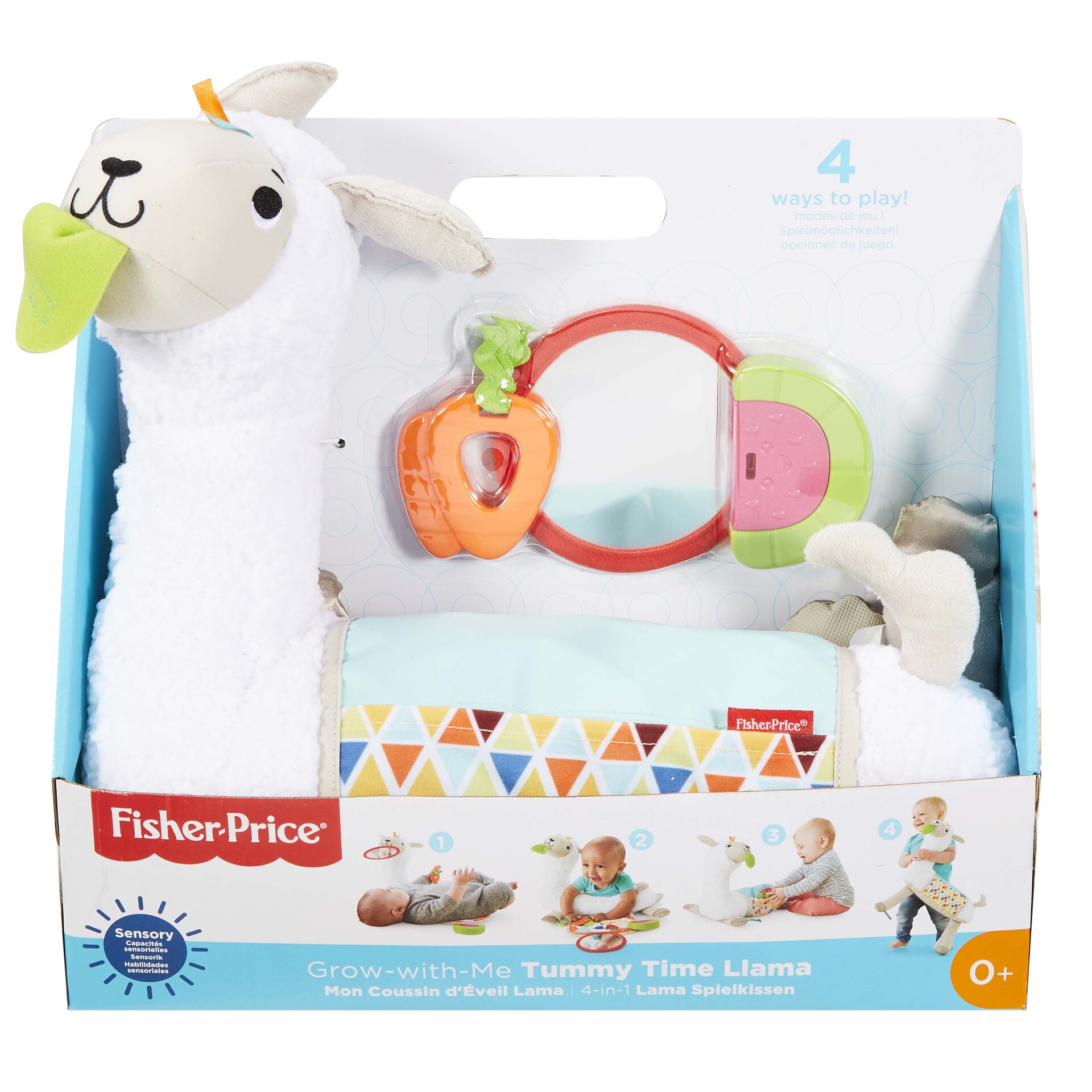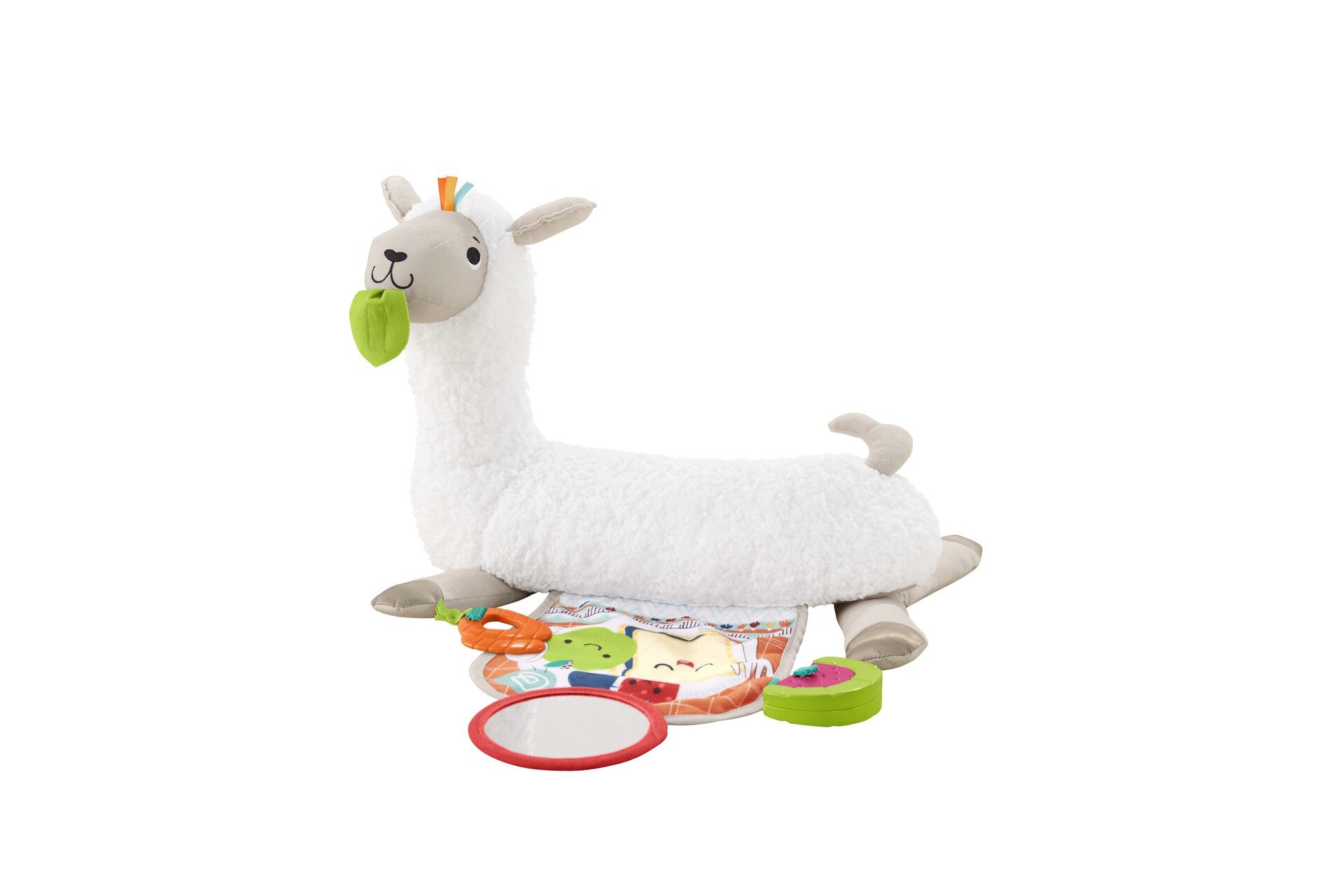 Voici un coussin multi activités en forme de lama proposant 4 modes découverte adaptés au développement de bébé et 3 jouets déveil :