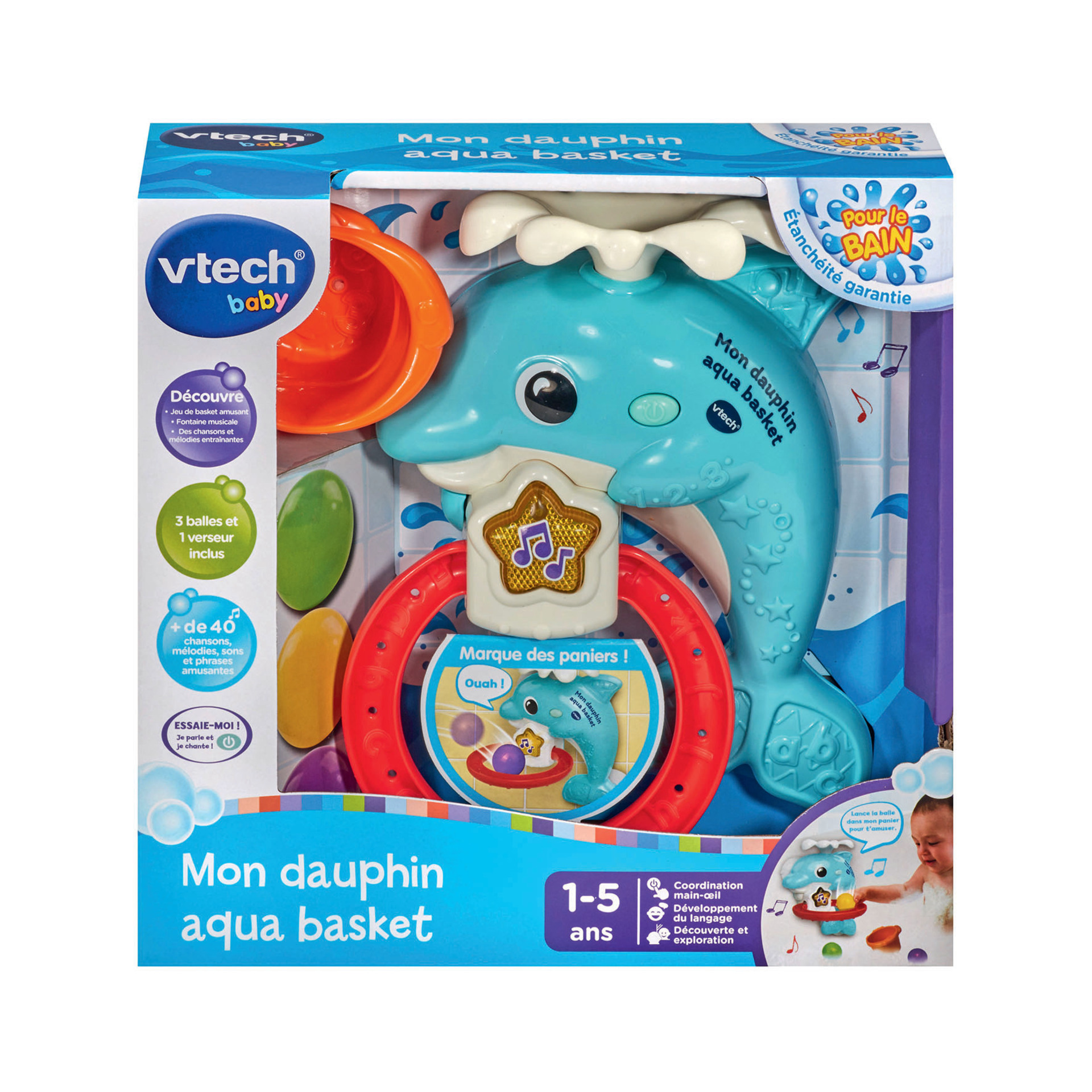 Mon dauphin aqua-basket - 1 - 5 ans Un dauphin trop rigolo pour jouer au basket et faire le plein de découvertes dans le bain ! - 2 ventouses au dos du jouet permettent de fixer le dauphin sur les parois d’une baignoire. - 1 bouton Musique lumineux déclenche des chansons, des mélodies, des sons et des phrases amusantes. - 1 panier de basket : en appuyant dessus, les tout-petits déclenchent des sons et des phrases rigolotes. - 3 balles colorées sont incluses pour pouvoir jouer avec le panier et devenir un vrai pro ! En versant de l’eau sur le dauphin grâce au verseur inclus, l’eau sort du panier par des jets amusants ! Pour un rangement plus facile, le panier de basket se replie. 3 chansons et 12 mélodies. Arrêt automatique. Boîte Try-me. Fonctionne avec 1 pile LR03 fournie.