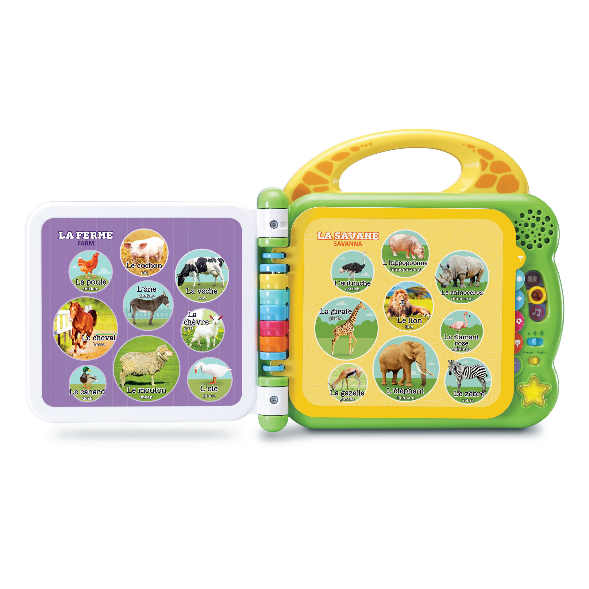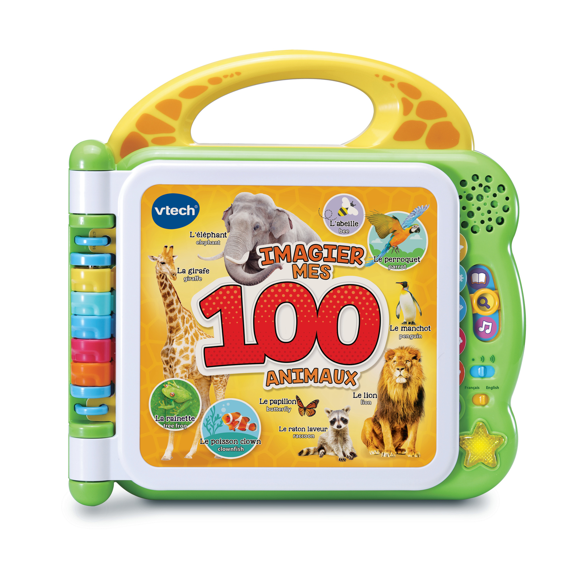 Mon imagier des animaux bilingue - 2 - 5 ans Cet imagier parlant et interactif permet de découvrir 100 animaux en français et en anglais. Le livre comporte 12 pages éducatives plastifiées et illustrées avec capteurs sensitifs pour sélectionner les illustrations et faire de nombreuses découvertes. Chaque page d’apprentissage est classée par thème : animaux de la ferme, de la savane, de la jungle…. Avec photos et illustrations 3 modes de jeu : Vocabulaire, Découvertes et Sons amusants. La poignée adaptée aux petits permet une prise en main facile. 3 chansons en anglais, 3 chansons en français et des effets sonores amusants ! 100 % bilingue (français / anglais) ! Arrêt automatique Boîte Try-me. Fonctionne avec 2 piles LR6 incluses.