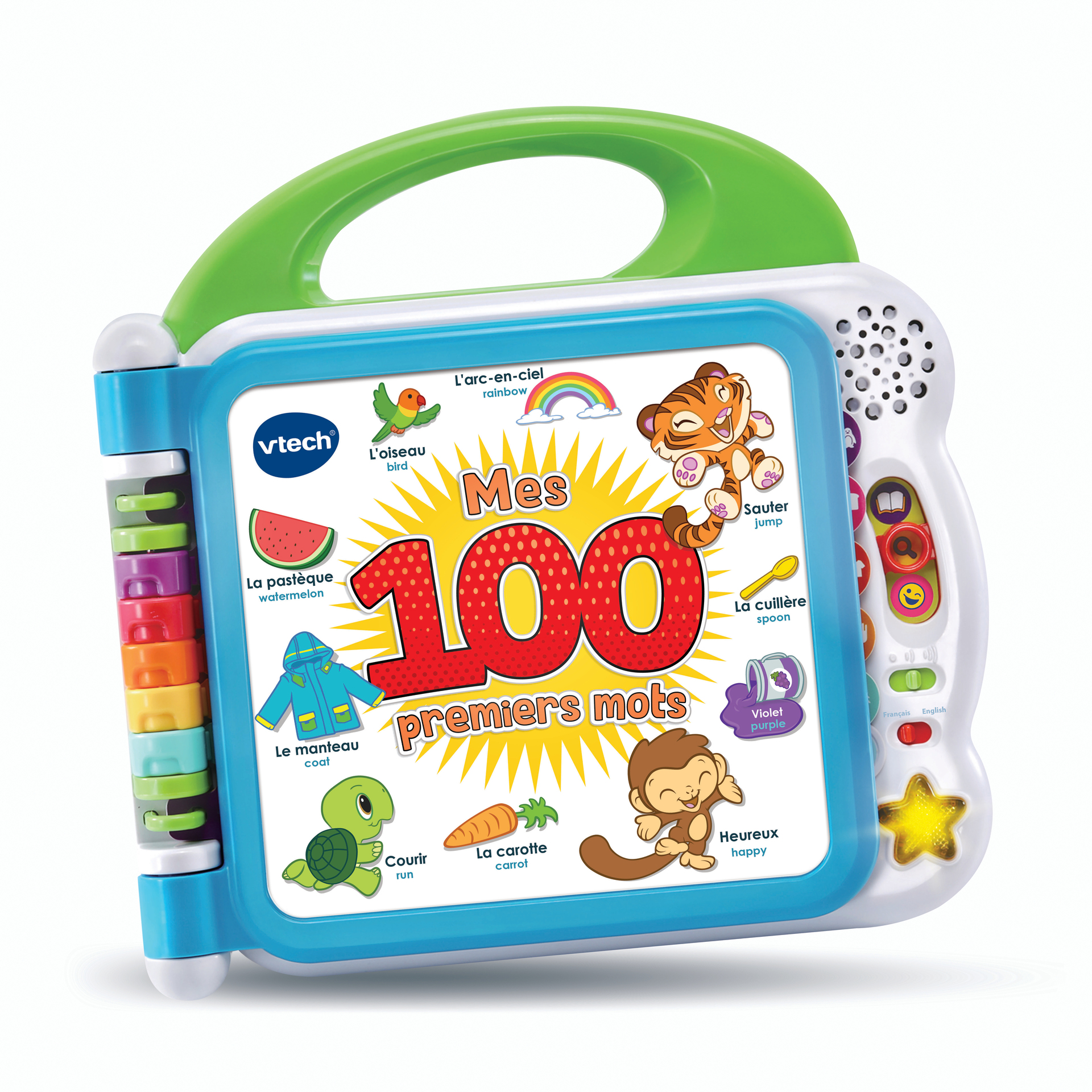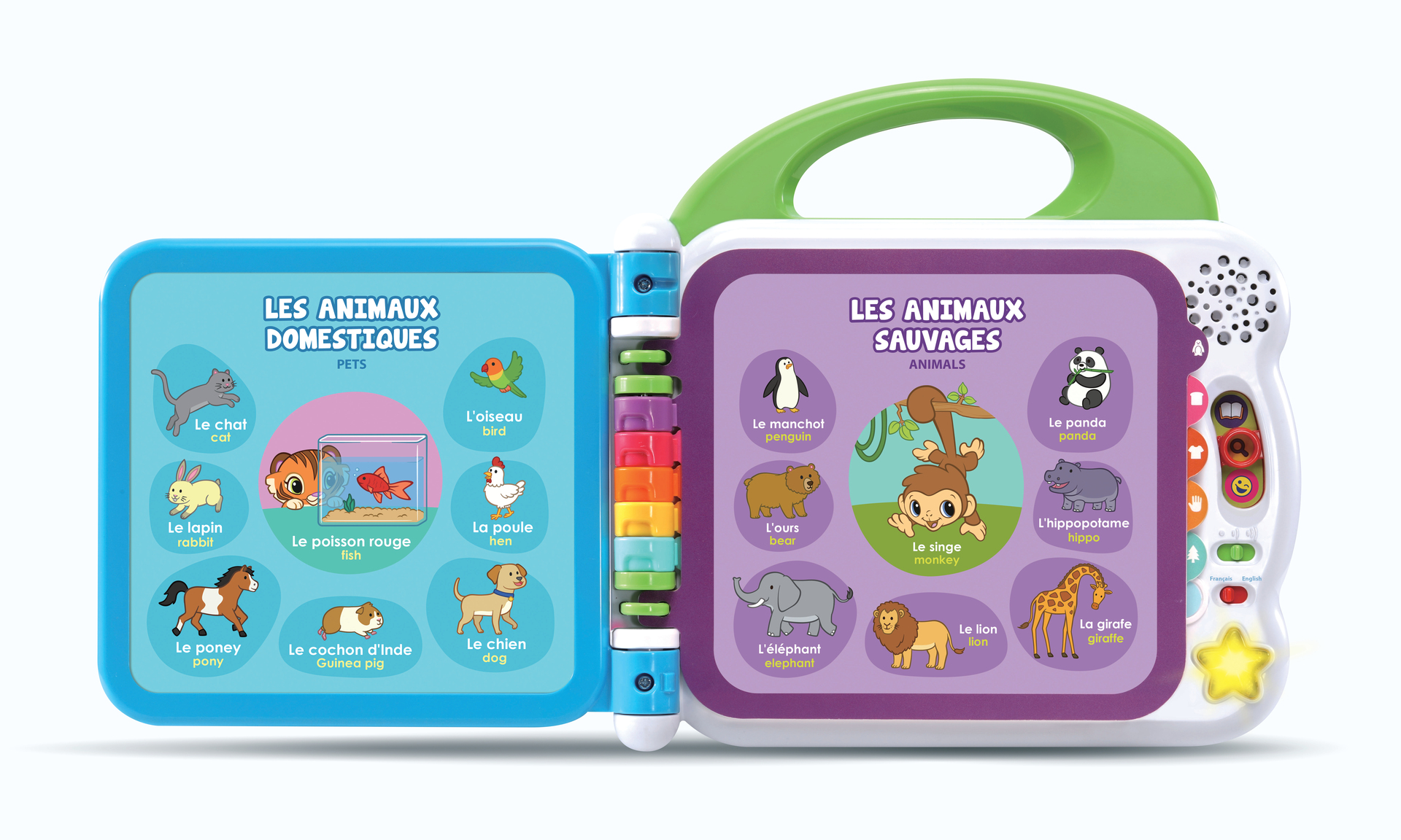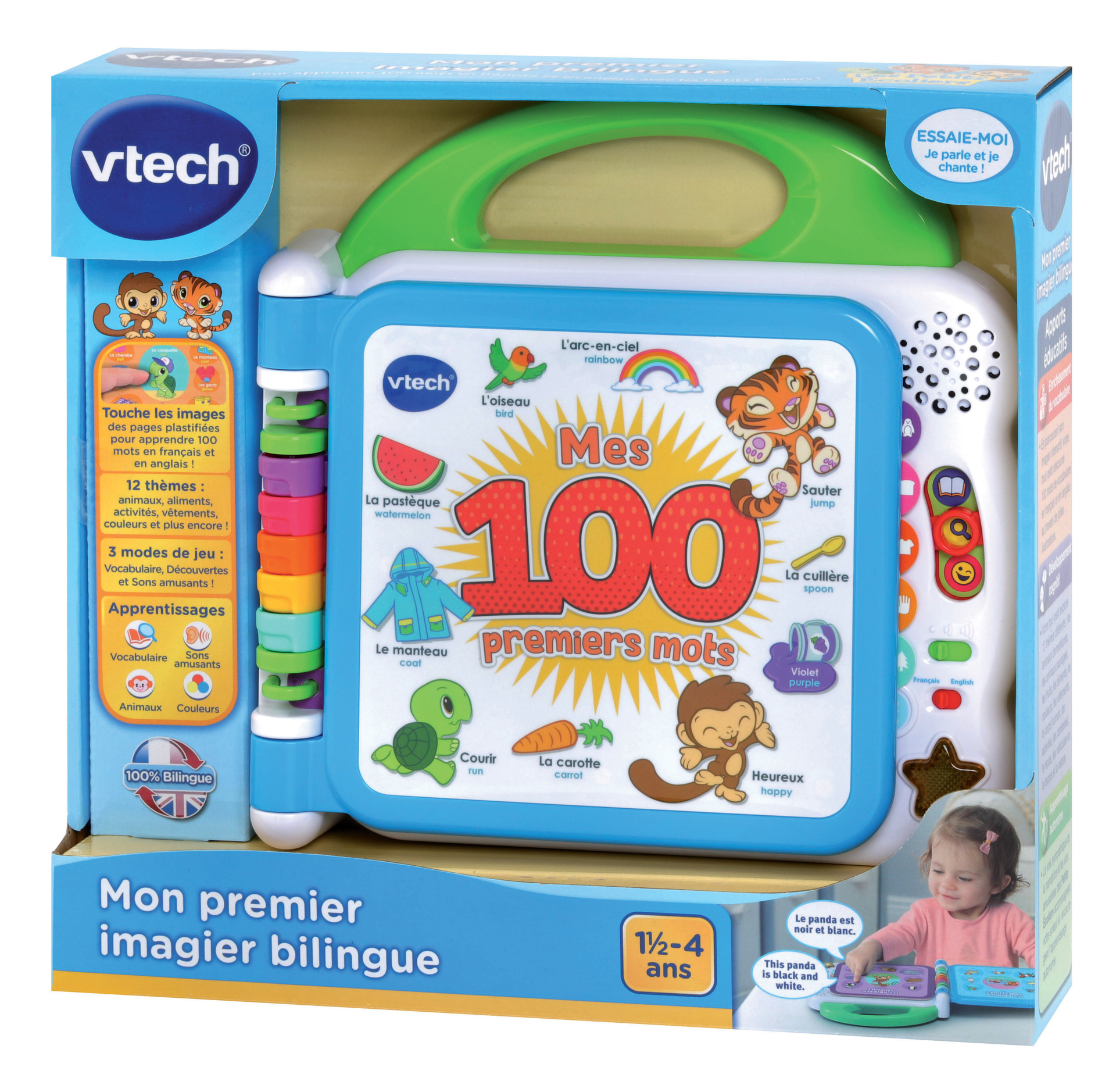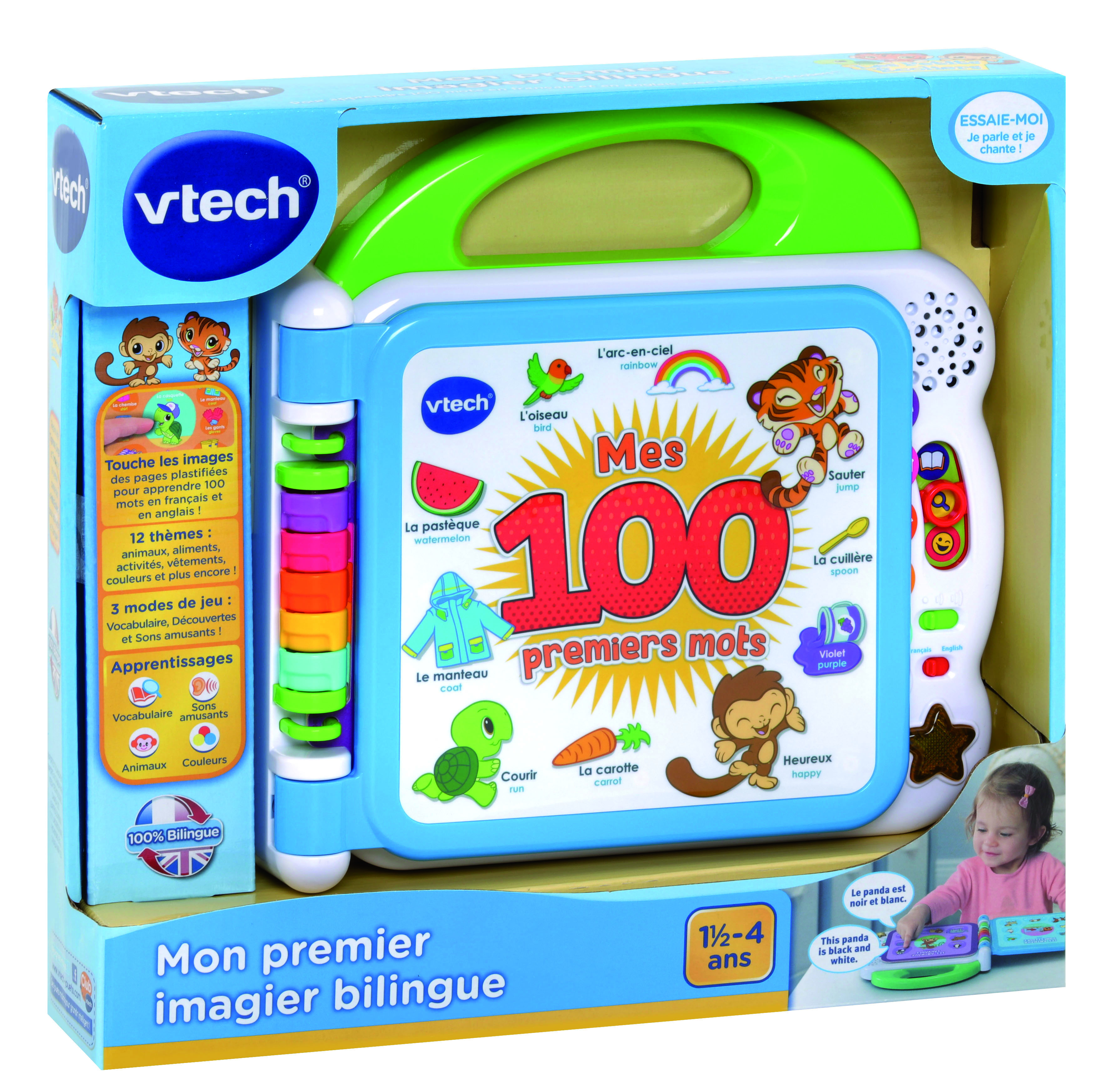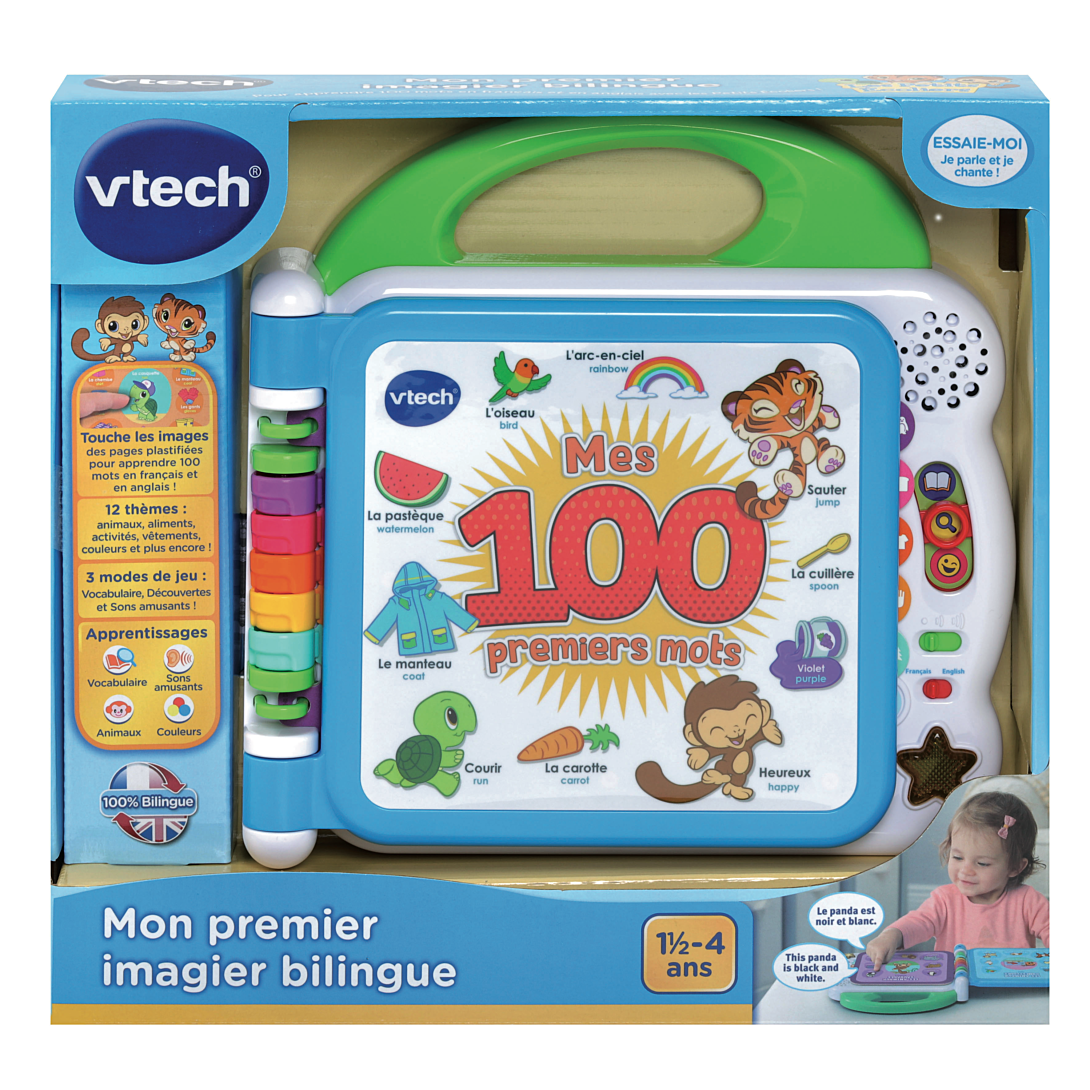 Mon premier imagier bilingue – 1,5 – 4 ans Cet imagier parlant et interactif permet de découvrir 100 mots de vocabulaire en français et en anglais avec les personnages « Les petites écoliers ». Le livre comporte 12 pages éducatives plastifiées et illustrées avec capteurs sensitifs pour sélectionner les illustrations et faire de nombreuses découvertes. Chaque page d’apprentissage est classée par thème : animaux domestiques / sauvages, fruits, aliments, couleurs, parties du corps, contraires… 3 modes de jeu : Vocabulaire, Découvertes et Sons amusants. La poignée adaptée aux petits permet une prise en main facile. 2 chansons en français + 2 chansons en anglais et effets sonores amusants. 100% bilingue ! Réglage du volume sonore et arrêt automatique. Fonctionne avec 2 piles LR6 fournies.