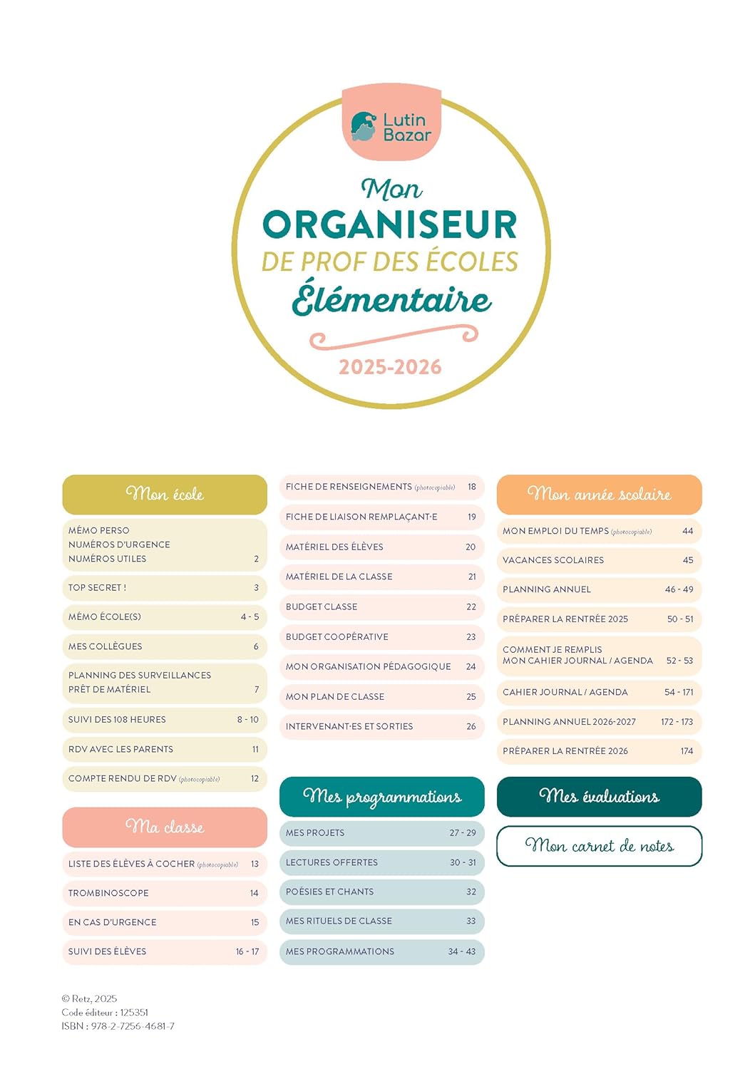 | Libellé | Mon organiseur de prof des écoles élémentaire 2025-2026 (Spirale) |