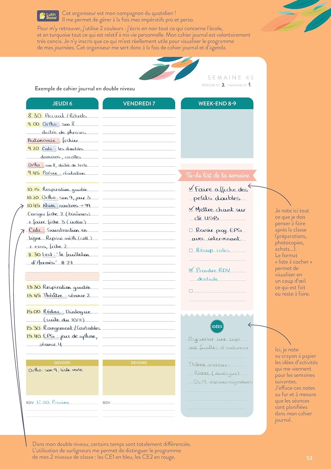 au format A3 (1 double-page par semaine, avec to-do list, notes, devoirs...)