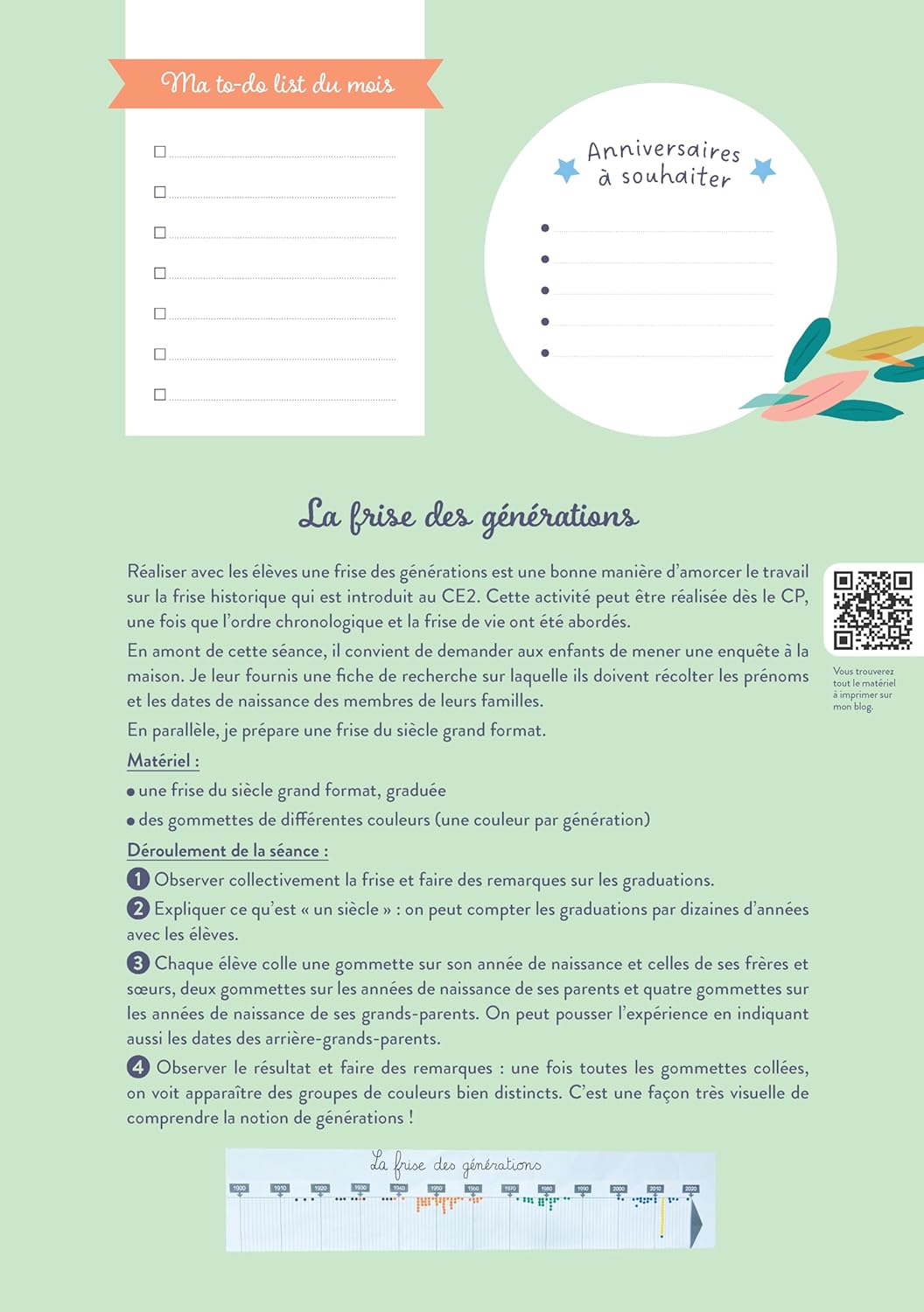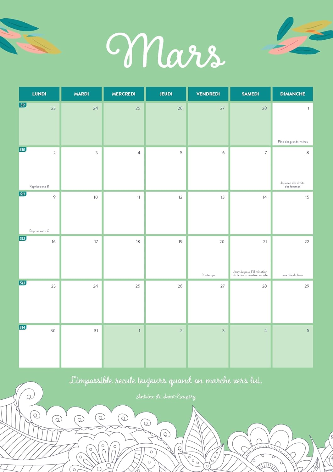 avec un conseil pédagogique, le calendrier mensuel, les anniversaires à souhaiter, une citation à méditer, un coloriage zen