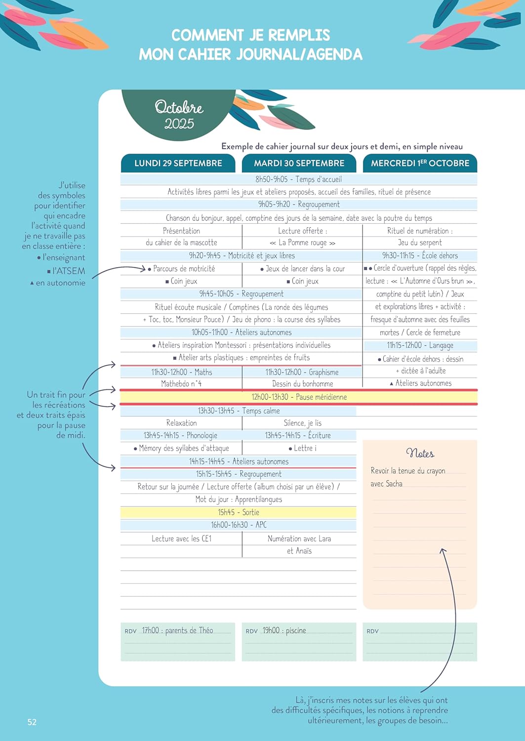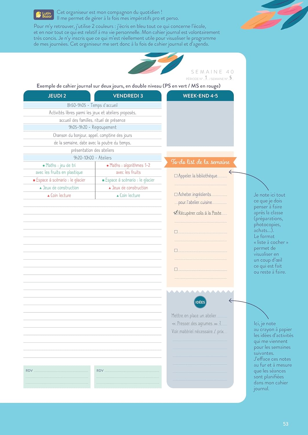 au format A3 (1 double-page par semaine, avec to-do list et notes) pour planifier ses différents ateliers, rituels, espaces et temps de regroupement