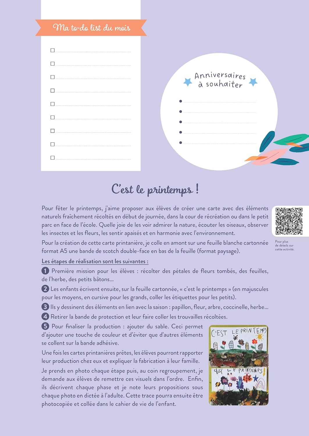 avec un conseil pédagogique, le calendrier mensuel, les anniversaires à souhaiter, une citation à méditer, un coloriage zen