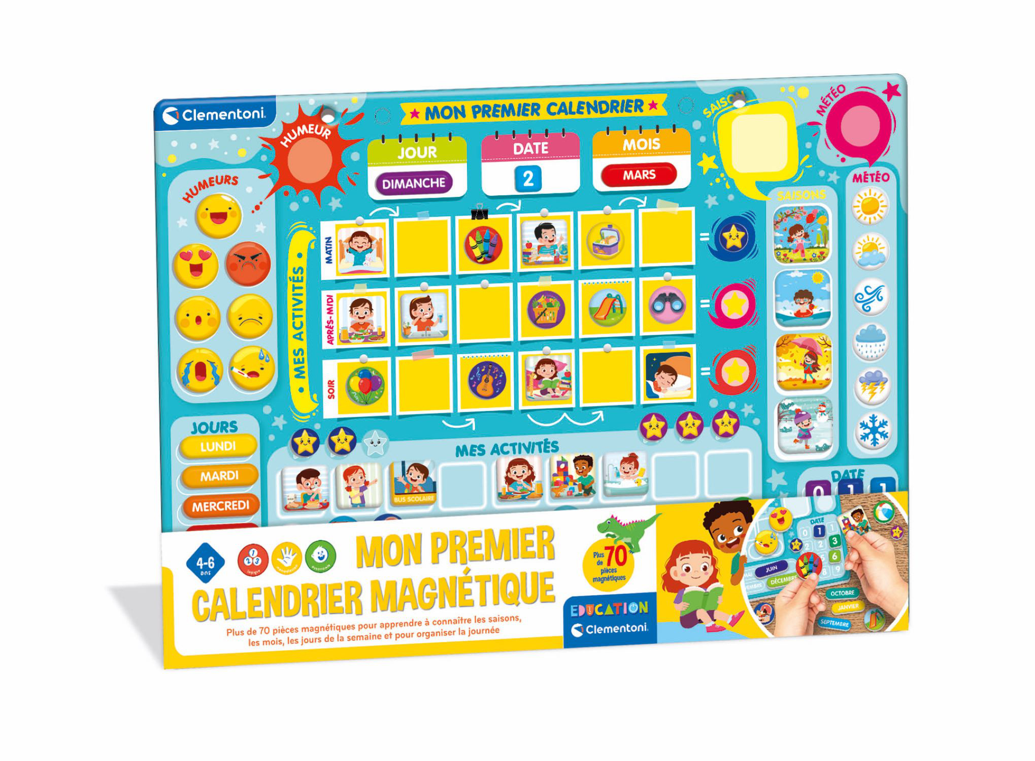 Découvrez le calendrier magnétique CLEMENTONI, parfait pour les enfants a partir de 3 ans. Avec de nombreux magnets inclus, il permet d'indiquer la saison, la date, les activités, la météo et l'humeur. Un outil ludique et éducatif pour apprendre en s'amusant !