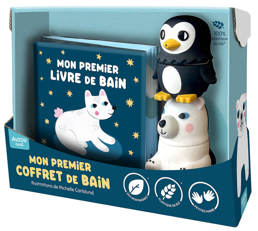 Ce coffret de bain comporte 1 livre de bain accordéon pour découvrir les animaux de la banquise, ainsi que 2 jouets de bain cracheurs en matière recyclée et éco-responsable.