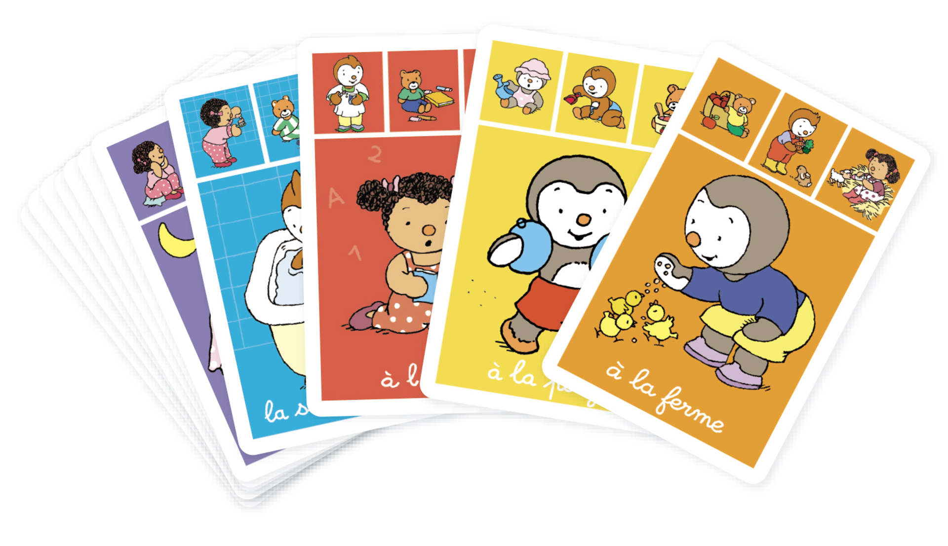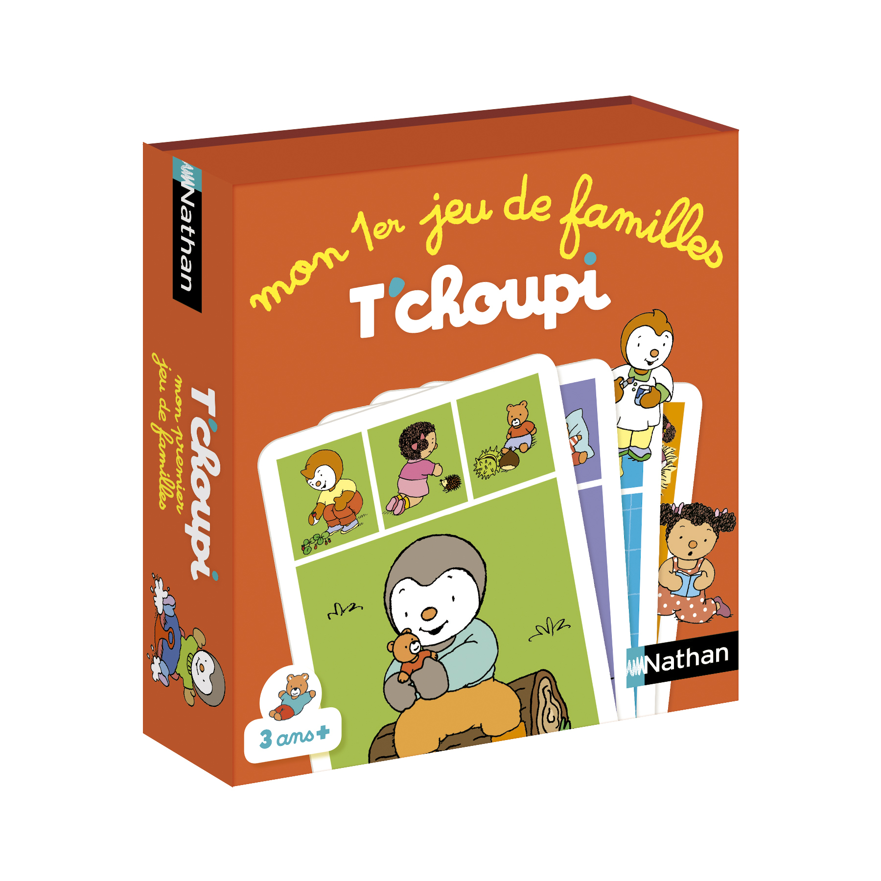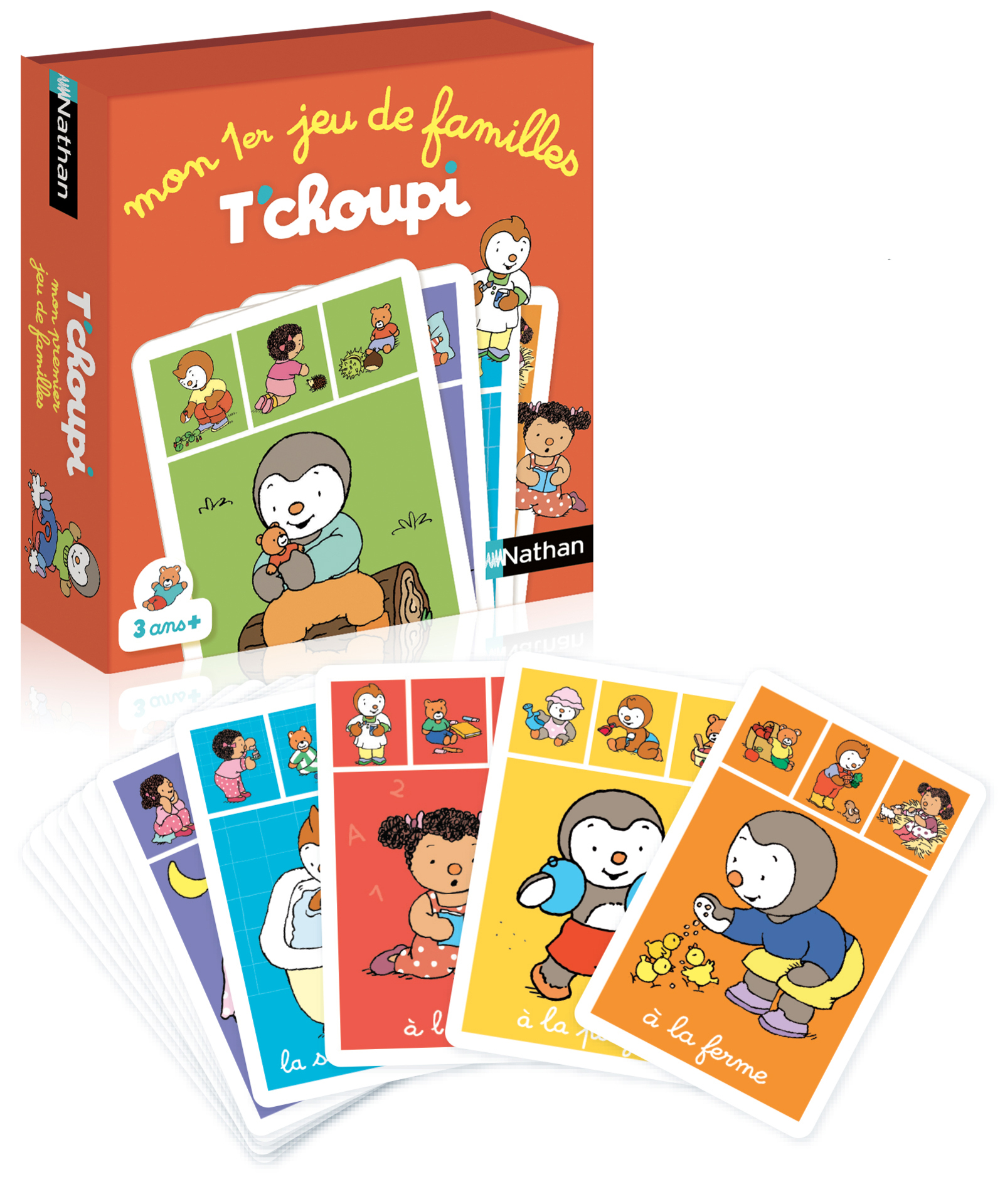 Un premier jeu de familles autour de l'univers de T'choupi. Le but du jeu cest avoir le plus de familles possible. Quand toutes les familles sont formées, celui qui en a le plus gagne. En haut des cartes figurent les autres images qui constitue la famille, pour aider les enfants à se repérer.