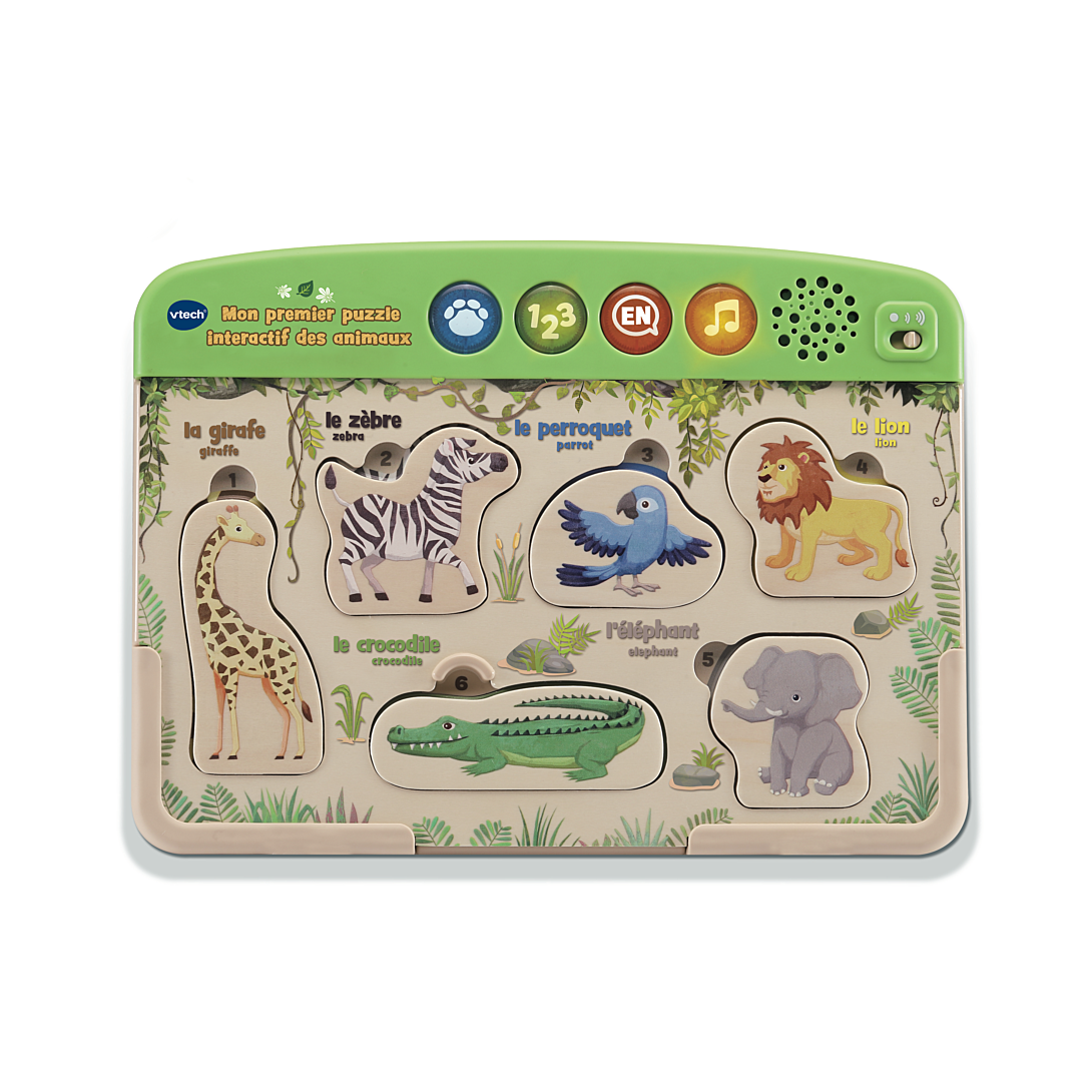 Mon premier puzzle interactif des animaux (jouet avec partie bois certifié FSC®) - 18 - 36 mois Bébé développe sa motricité fine avec son puzzle d’encastrement en partie bois certifié FSC®. Magique ! Le jouet reconnaît lorsqu’un animal est correctement placé. Bébé découvre alors le nom de l’animal, son cri, son habitat, apprend à compter et découvre quelques mots en anglais. Quatre boutons lumineux : Animaux, Chiffres, Anglais et Musique. Quand bébé enlève une pièce du puzzle, il découvre des informations sur l’illustration cachée. 1 chanson et 5 mélodies. Puzzle en partie en bois avec bords antichocs. La partie plastique de ce jouet est fabriquée avec 85 % de plastique réutilisé issu de chutes de production pour contribuer à la réduction des déchets. Arrêt automatique Boîte try-me. Fonctionne avec 3 piles LR03/AAA fournies.