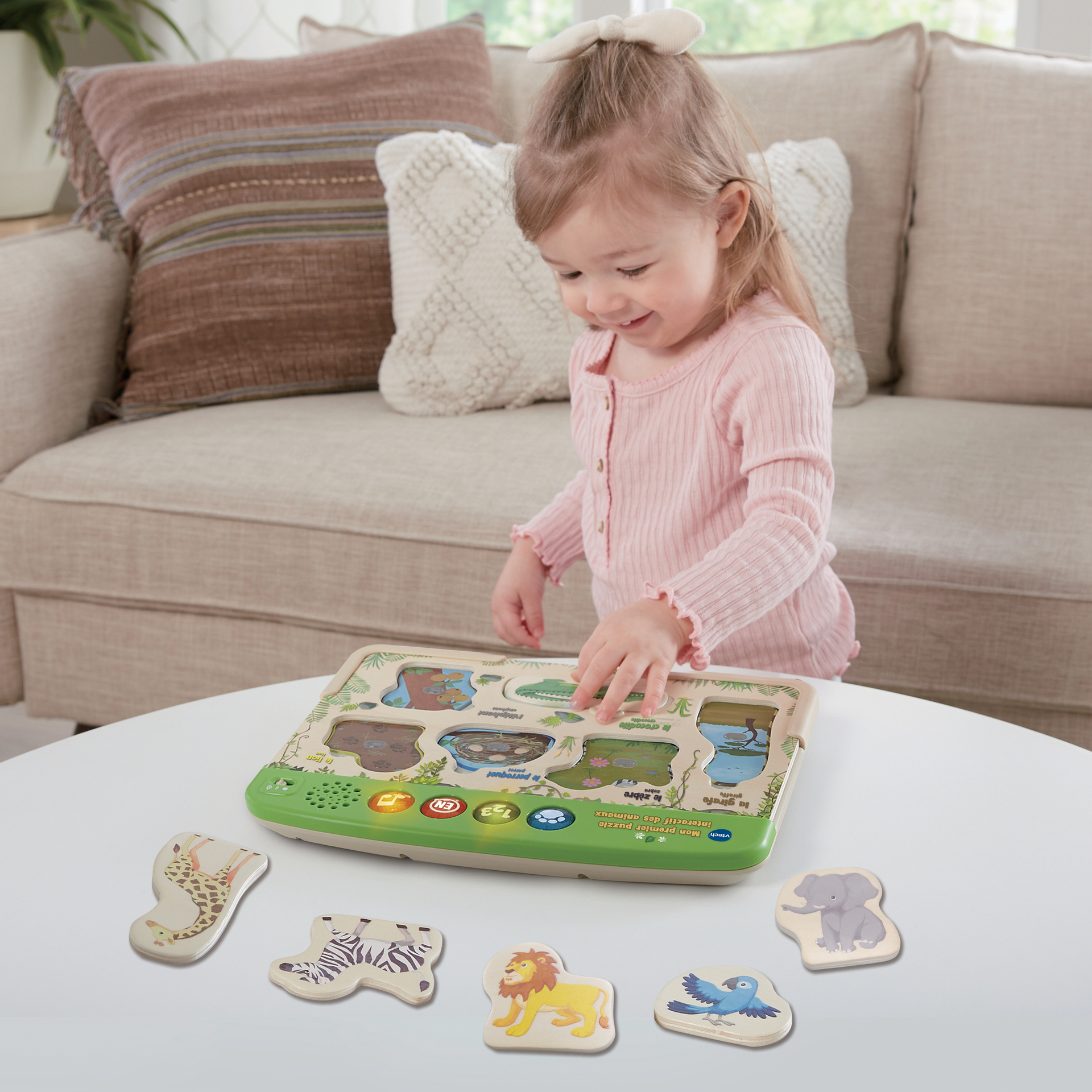 Mon premier puzzle interactif des animaux (jouet avec partie bois certifié FSC®) - 18 - 36 mois Bébé développe sa motricité fine avec son puzzle d’encastrement en partie bois certifié FSC®. Magique ! Le jouet reconnaît lorsqu’un animal est correctement placé. Bébé découvre alors le nom de l’animal, son cri, son habitat, apprend à compter et découvre quelques mots en anglais. Quatre boutons lumineux : Animaux, Chiffres, Anglais et Musique. Quand bébé enlève une pièce du puzzle, il découvre des informations sur l’illustration cachée. 1 chanson et 5 mélodies. Puzzle en partie en bois avec bords antichocs. La partie plastique de ce jouet est fabriquée avec 85 % de plastique réutilisé issu de chutes de production pour contribuer à la réduction des déchets. Arrêt automatique Boîte try-me. Fonctionne avec 3 piles LR03/AAA fournies.