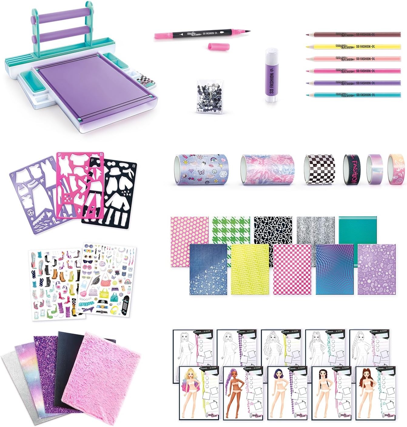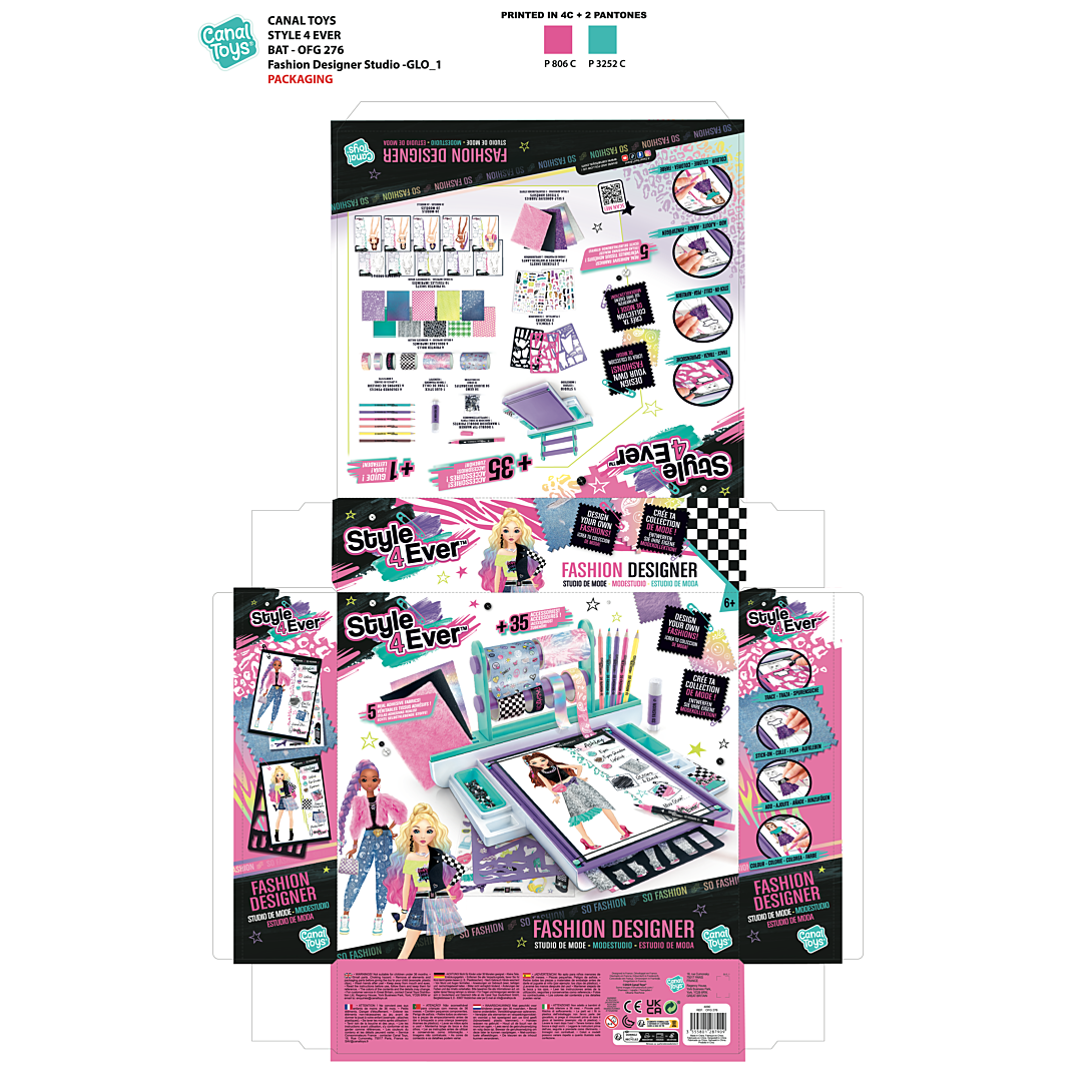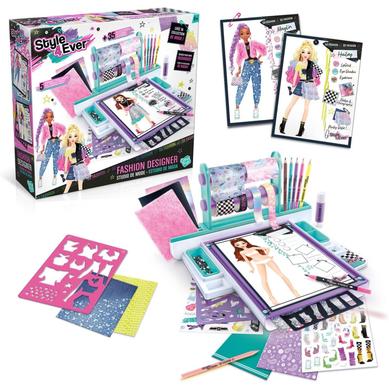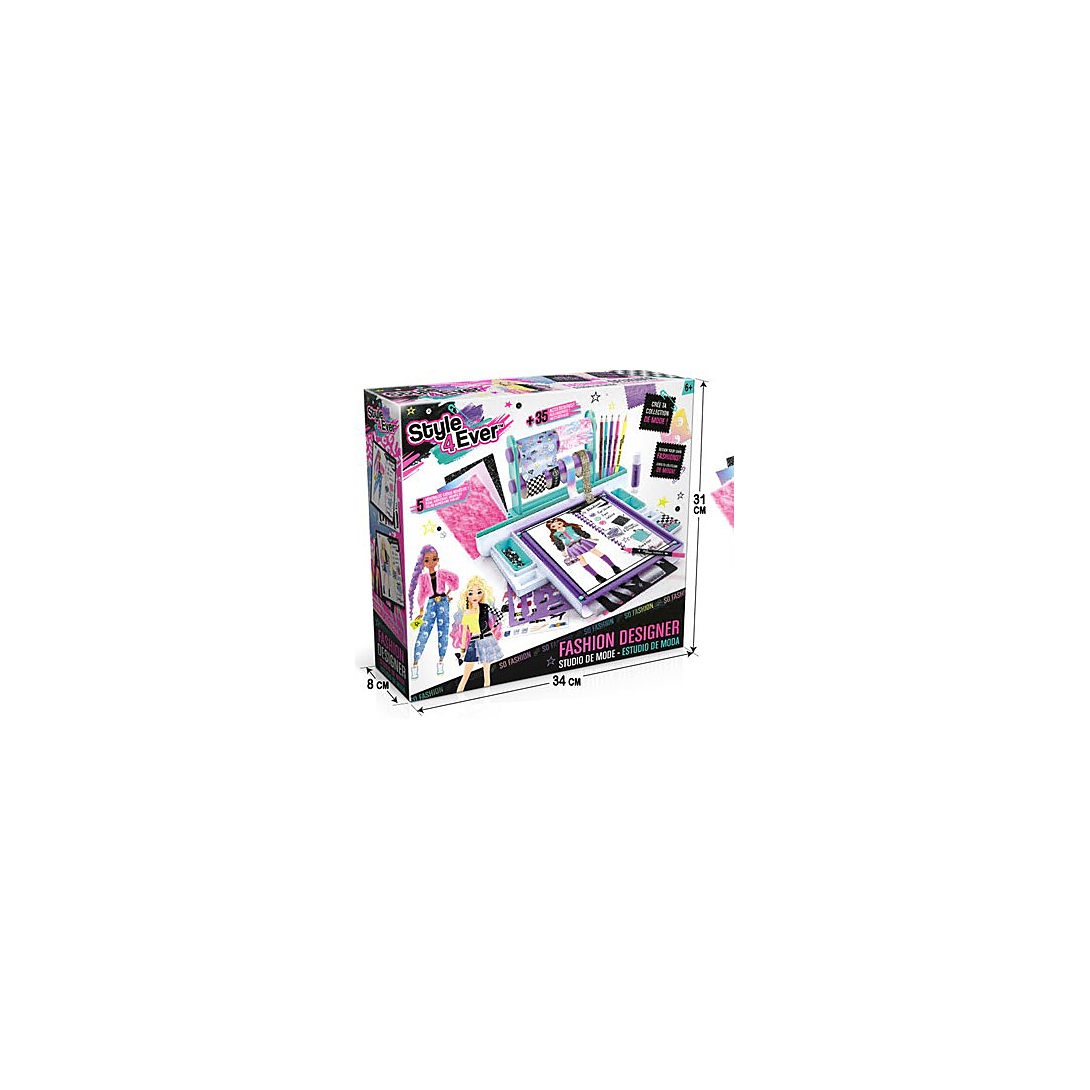 Révèle ton talent de styliste et crée ta collection avec ce Studio de mode ! Les nombreux accessoires inclus te permettont de réaliser facilement de nombreuses tenues. Il est équipé de tout le nécessaire du styliste: pochoirs, tissus, papiers imprimés, rubans, colles, ciseaux, crayons… Les modèles correspondent vraiment à la tendance actuelle.