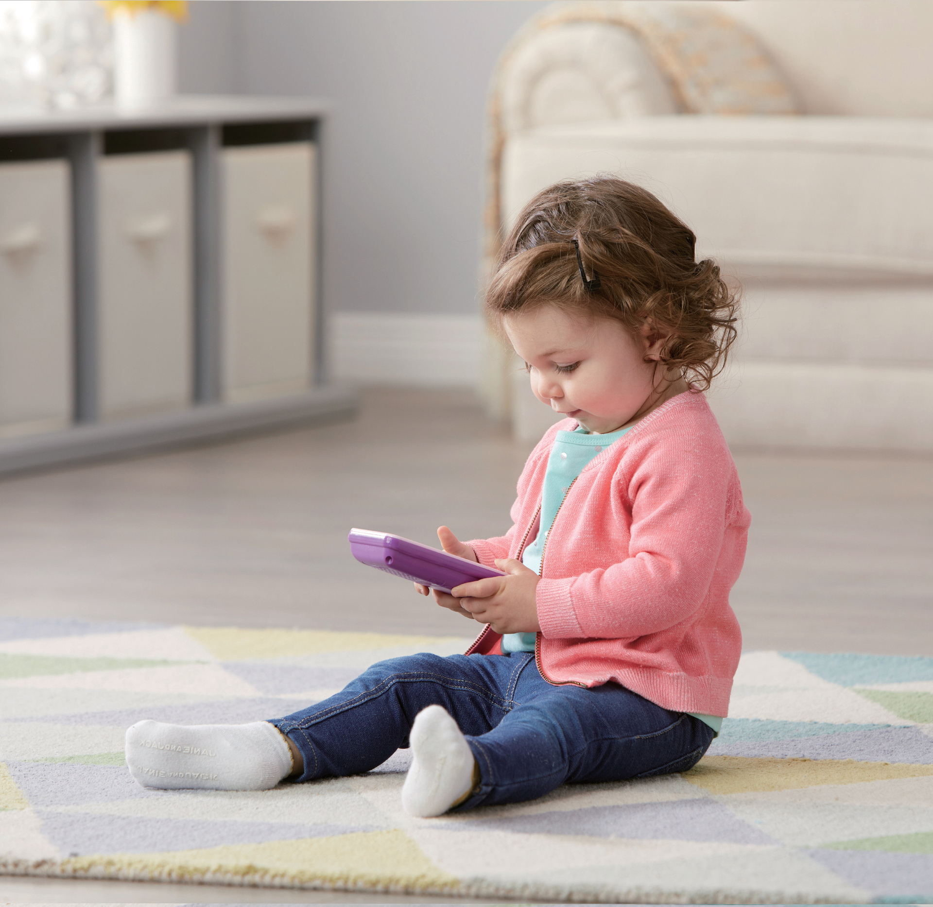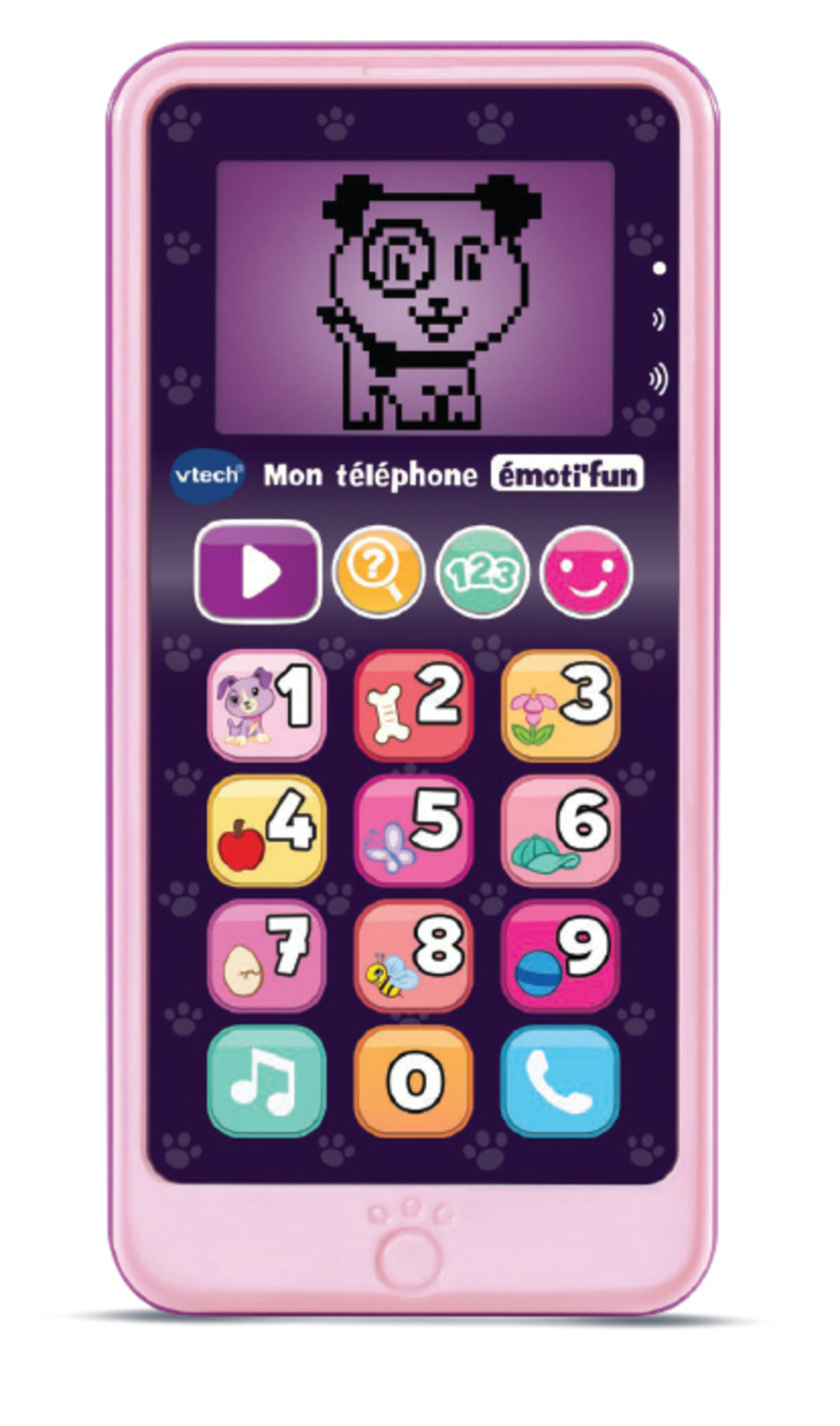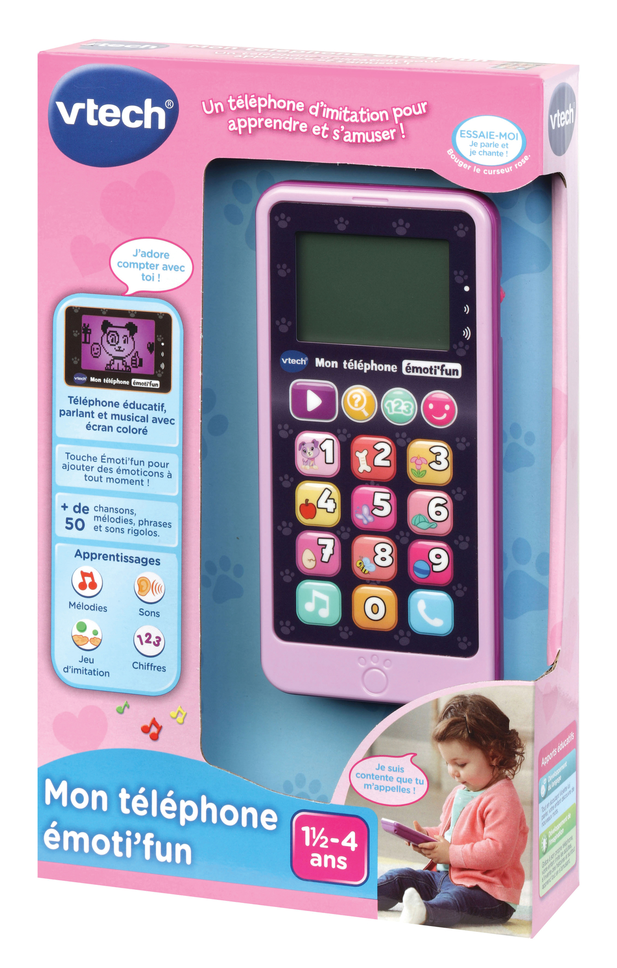 Mon téléphone émoti'fun (rose) - 1,5 - 4 ans Un joli téléphone pour apprendre en s'amusant ! Écran LCD rétro éclairé. 12 touches lumineuses et tactiles. 2 jeux inclus : Devinettes et Jeu des chiffres. Touche "vidéo" avec 3 petites animations de Violette à regarder. Touche émoti'fun pour ajouter des émoticons. Plus de 50 phrases, chansons, activités et animations. Réglage du volume sonore et arrêt automatique. Boîte Try me. 3 piles LR03 incluses.